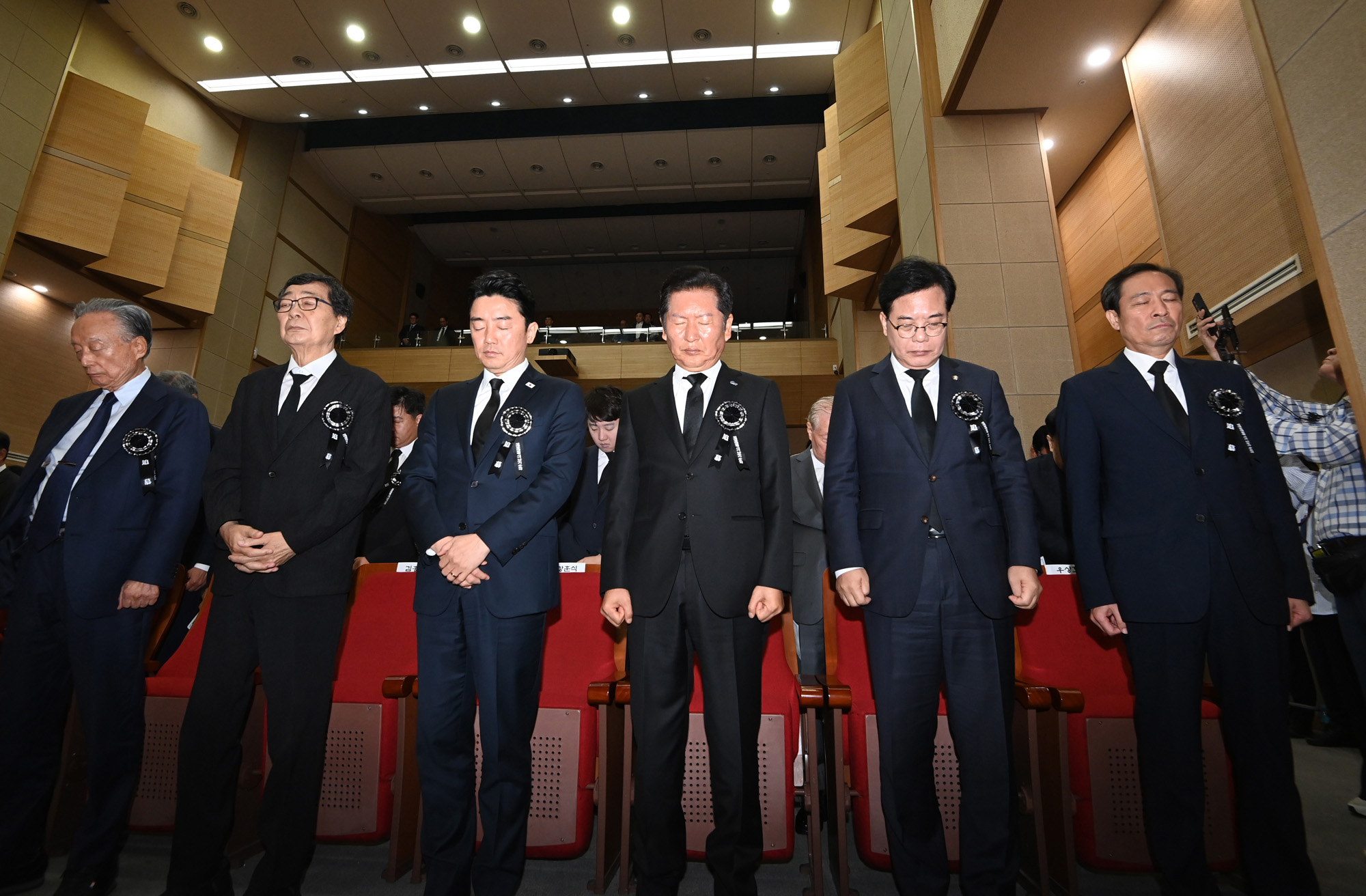 참석자들이 18일 오전 서울 동작구 국립서울현충원 현충관에서 열린 ‘김대중 전 대통령 서거 16주기 추도식’에서 묵념을 하고 있다. 앞줄 왼쪽부터 권노갑 김대중재단 이사장, 김홍업 김대중평화센터 이사장, 강훈식 대통령실 비서실장, 정청래 더불어민주당 대표, 송언석 국민의힘 비상대책위원장 겸 원내대표, 우상호 대통령실 정무수석. 2025.08.18 박윤슬 기자 |