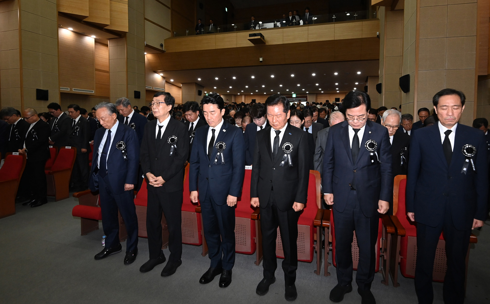 참석자들이 18일 오전 서울 동작구 국립서울현충원 현충관에서 열린 ‘김대중 전 대통령 서거 16주기 추도식’에서 묵념을 하고 있다. 앞줄 왼쪽부터 권노갑 김대중재단 이사장, 김홍업 김대중평화센터 이사장, 강훈식 대통령실 비서실장, 정청래 더불어민주당 대표, 송언석 국민의힘 비상대책위원장 겸 원내대표, 우상호 대통령실 정무수석. 2025.08.18 박윤슬 기자 |