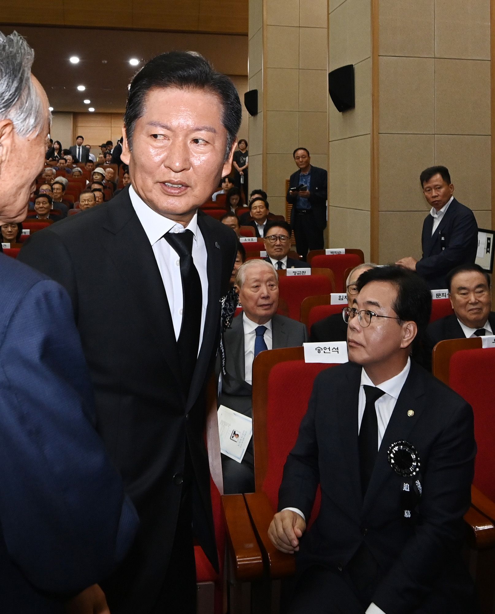 정청래 더불어민주당 대표와 송언석 국민의힘 비상대책위원장 겸 원내대표가 18일 서울 동작구 국립서울현충원 현충관에서 열린 '김대중 전 대통령 서거 16주기 추도식'을 마치고 자리에서 일어나고 있다.