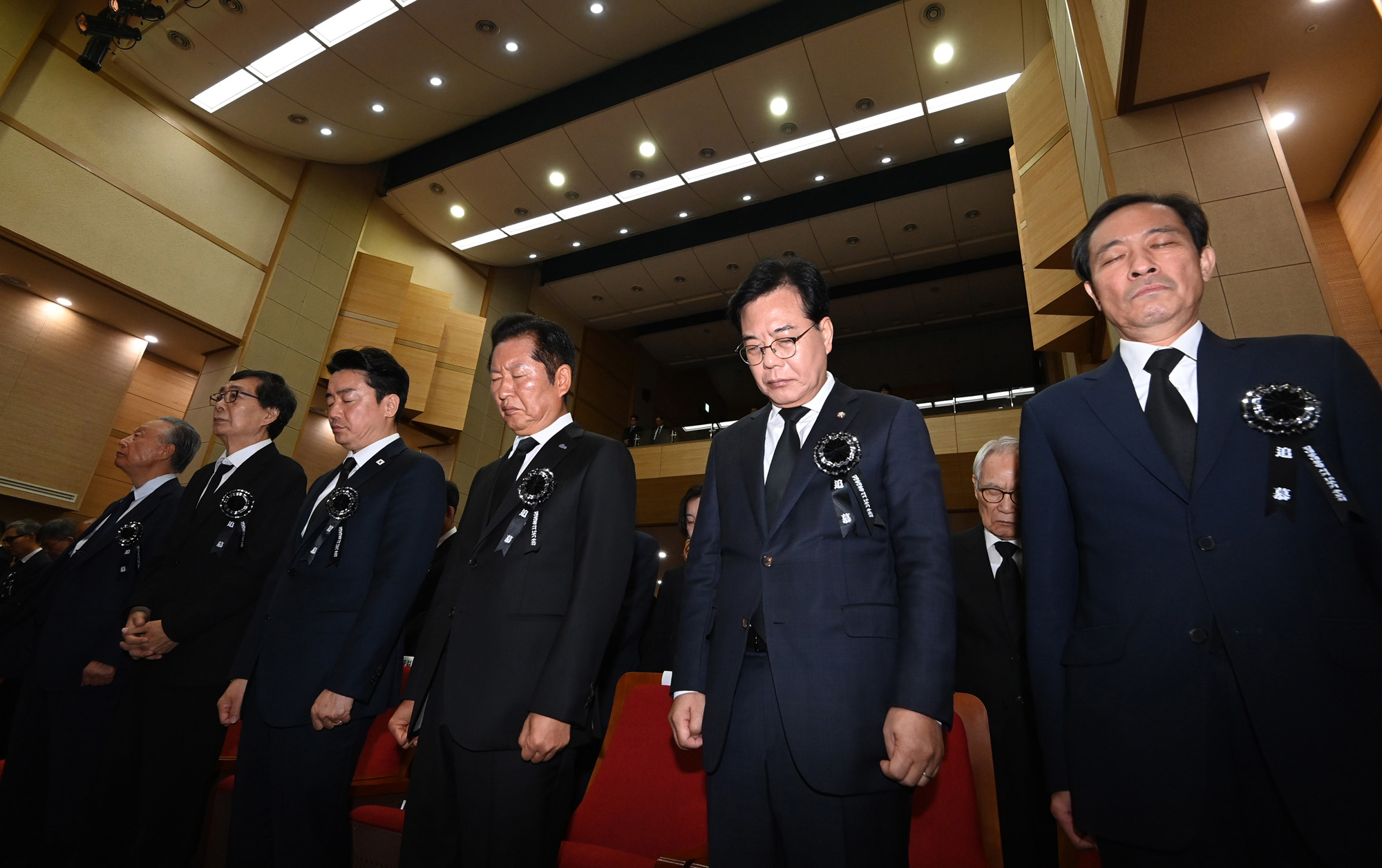 참석자들이 18일 오전 서울 동작구 국립서울현충원 현충관에서 열린 ‘김대중 전 대통령 서거 16주기 추도식’에서 묵념을 하고 있다. 앞줄 왼쪽부터 권노갑 김대중재단 이사장, 김홍업 김대중평화센터 이사장, 강훈식 대통령실 비서실장, 정청래 더불어민주당 대표, 송언석 국민의힘 비상대책위원장 겸 원내대표, 우상호 대통령실 정무수석. 2025.08.18 박윤슬 기자 |
