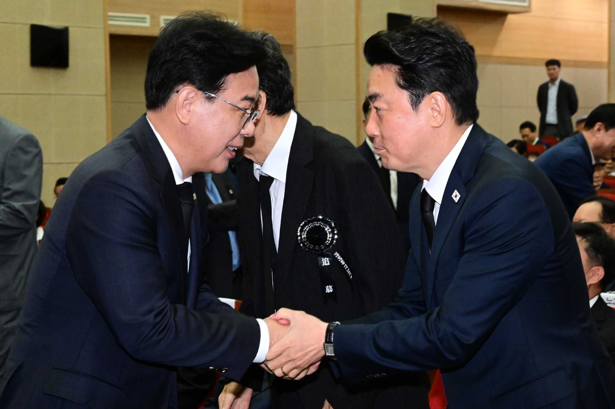 [더팩트ㅣ남윤호 기자] 송언석 국민의힘 비상대책위원장 겸 원내대표가 18일 서울 동작구 국립서울현충원 현충관에서 열린 '김대중 전 대통령 서거 16주기 추도식'에 참석해 강훈식 대통령비서실장과 인사하고 있다.