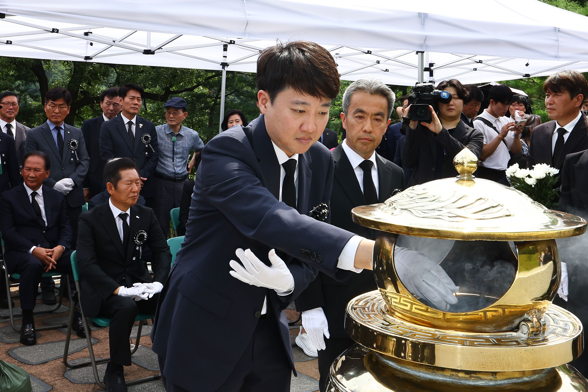 이준석 개혁신당 대표가 18일 국립서울현충원 고 김대중 전 대통령 묘역에서 분향하고 있다. 20250818 사진공동취재단