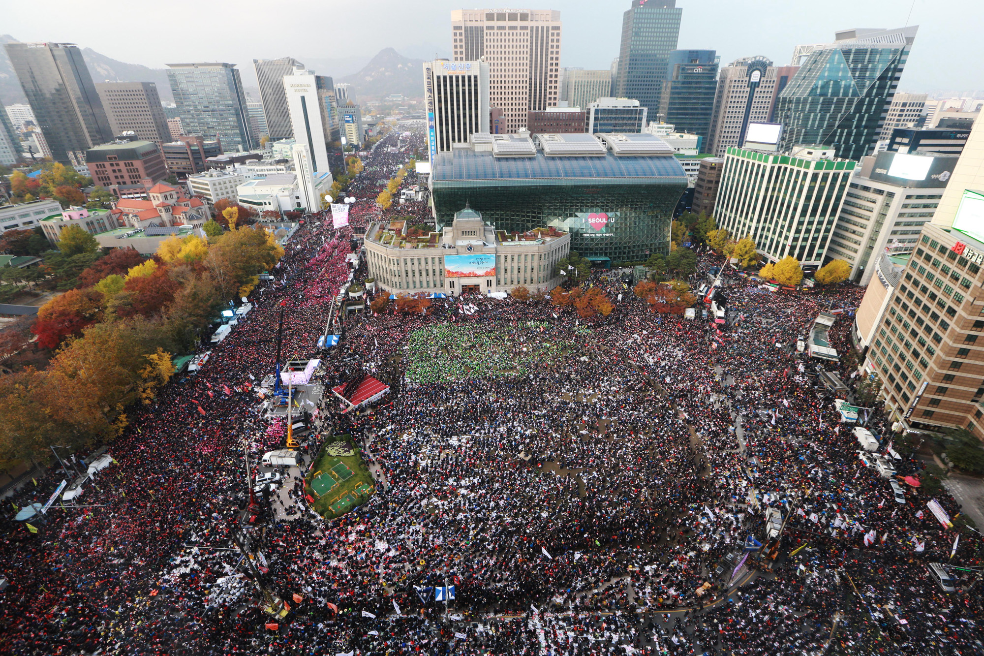 12일 서울 잔디광장에서 열린 박근혜 퇴진을 위한 3차 촛불집회 (민중총궐기)에 수많은 시민이 참석한 가운데 촛불을 들고 광화문 광장과 청와대쪽으로 행진하고 있다. 프라자(플라자) 호텔에서 내려다 본 모습