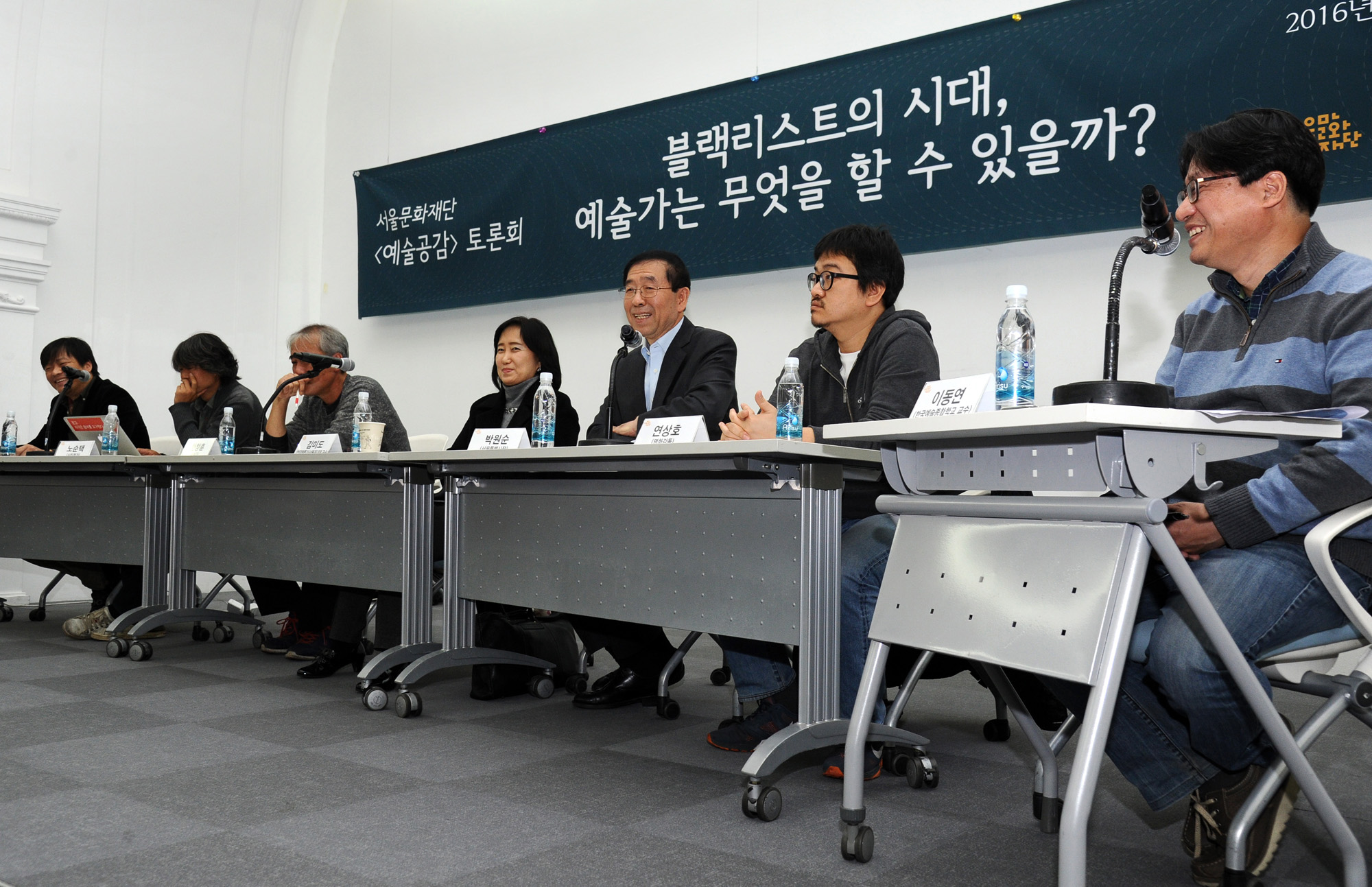 | 사진설명 | 9일 오전 서울 중구 서울시청 시민청 태평홀에서 서울문화재단 주최로 '블랙리스트의 시대, 예술가는 무엇을 할 수 있을까?' 토론회가 열리고 있다. 이날 토론회는 이동연 한국예술종합학교 교수의 사회로 진행됐으며 지난해 국립국악원 예술검열 논란의 대상이 된 공연 '소월산천'의 신현식 앙상블 시나위 대표를 비롯해 영화감독 연상호, 사진작가 노순택, 소설가 한창훈, 연극평론가 김미도 등 예술인과 박원순 서울시장이 참석했다. 서울시 제공 |