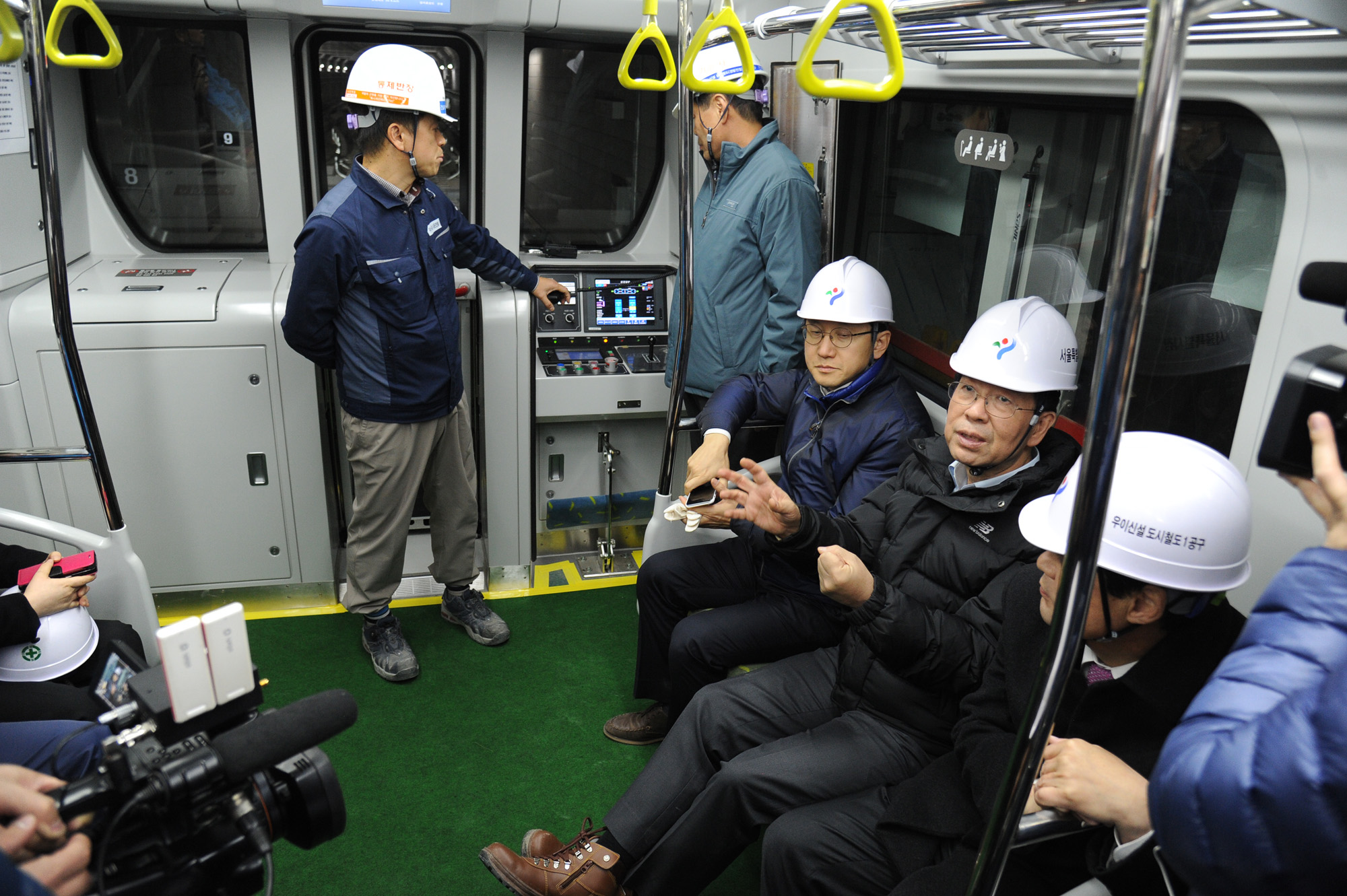 박원순 서울 시장은 9일 강북구 우이동 우이∼신설 경전철 시운전 차량에 탑승해 4개역을 이동하며 사업 전반을 점검한다. 서울시 제공