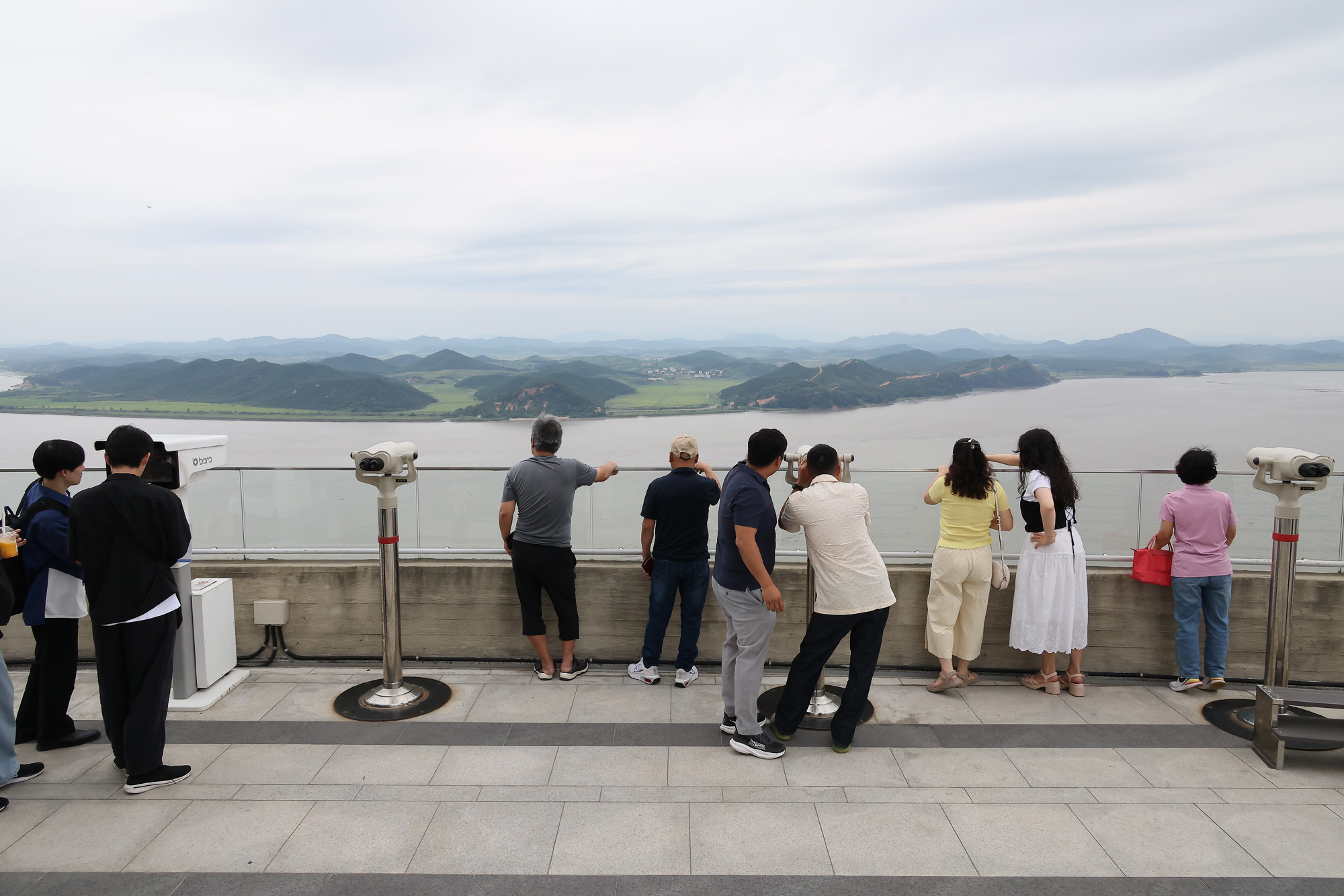 [김포=eoimage] 임준선기자 = 28일 경기 김포시 애기봉 평화생태공원 전망대를 찾은 시민들이 북한 황해도 개풍군을 바라보고 있다. 2025.08.28