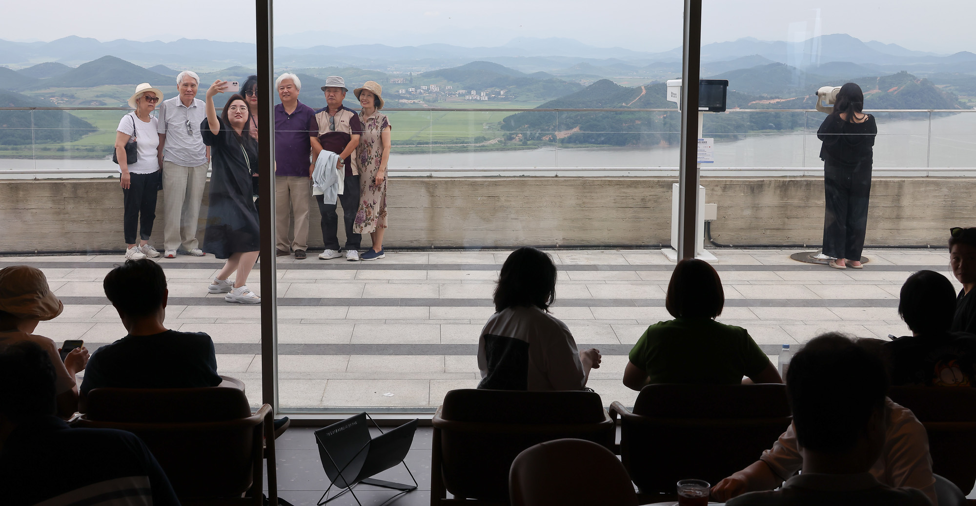 [김포=eoimage] 임준선기자 = 28일 경기 김포시 애기봉 평화생태공원 전망대를 찾은 시민들이 북한 황해도 개풍군을 바라보고 있다. 2025.08.28