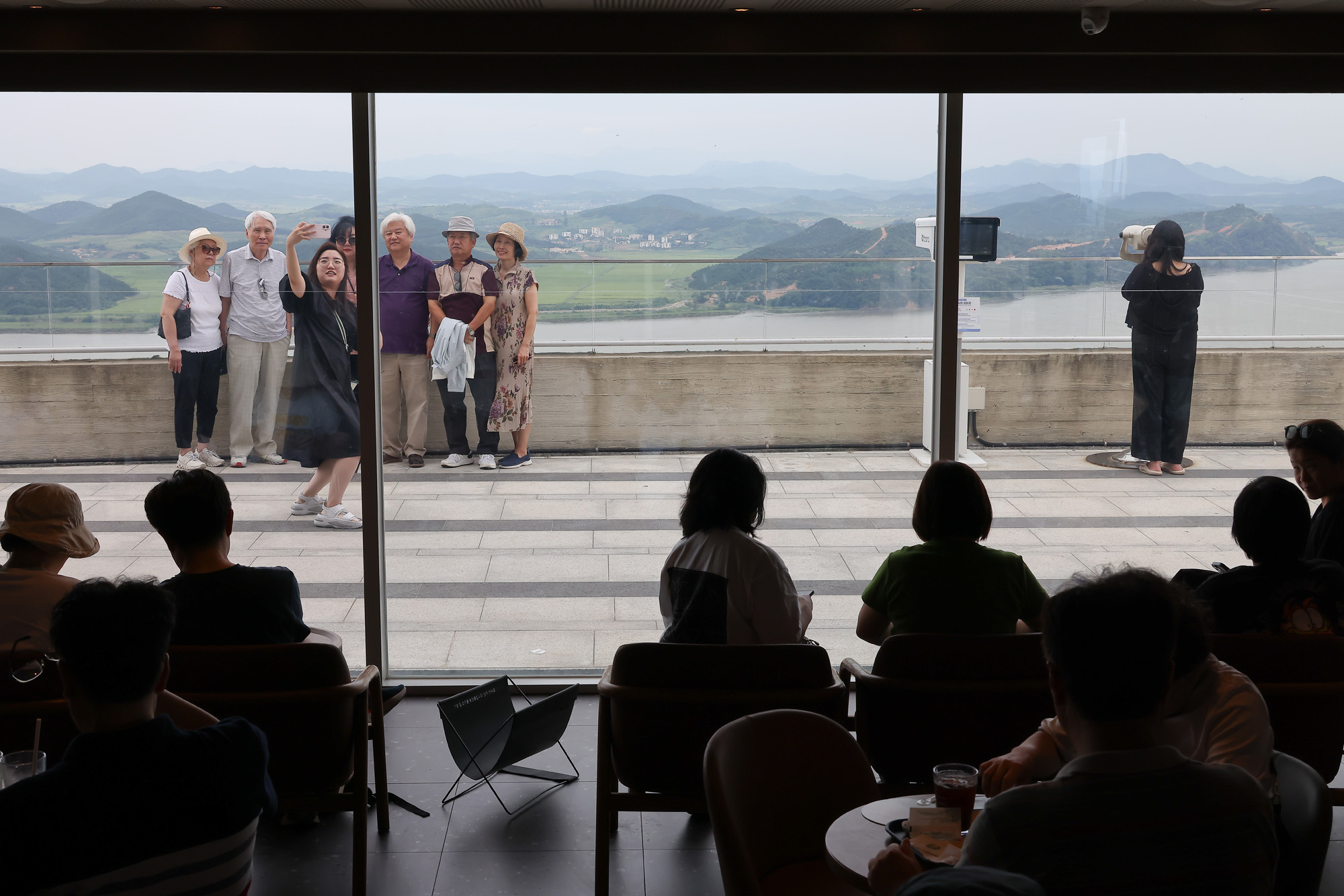 [김포=eoimage] 임준선기자 = 28일 경기 김포시 애기봉 평화생태공원 전망대를 찾은 시민들이 북한 황해도 개풍군을 바라보고 있다. 2025.08.28