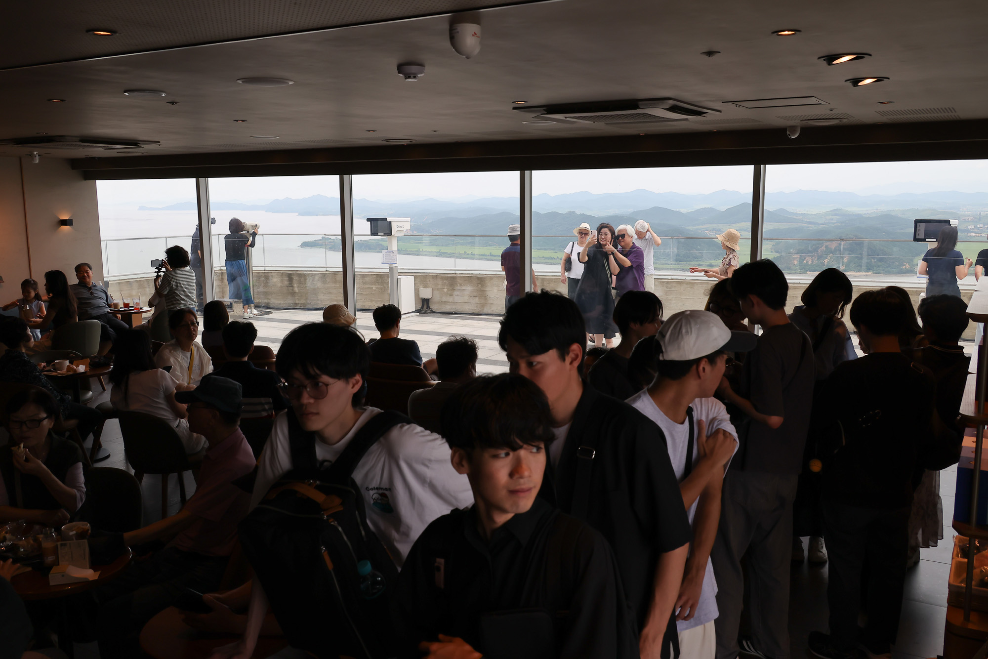 [김포=eoimage] 임준선기자 = 28일 경기 김포시 애기봉 평화생태공원 전망대를 찾은 시민들이 북한 황해도 개풍군을 바라보고 있다. 2025.08.28