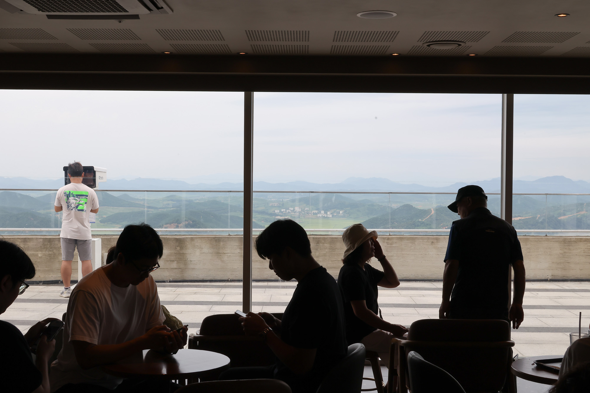 [김포=eoimage] 임준선기자 = 28일 경기 김포시 애기봉 평화생태공원 전망대를 찾은 시민들이 북한 황해도 개풍군을 바라보고 있다. 2025.08.28