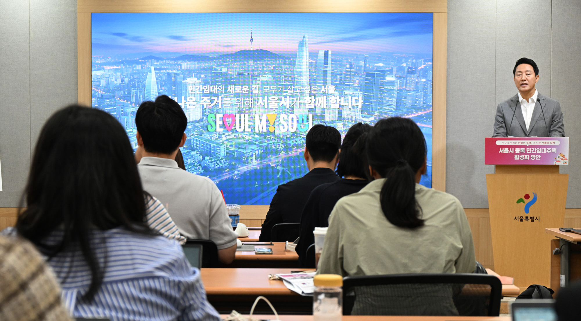 오세훈 서울시장이 1일(수) 오전 서울시청에서 등록 민간임대주택 활성화 기자설명회에서 정책을 발표하고 있다. 서울시 제공