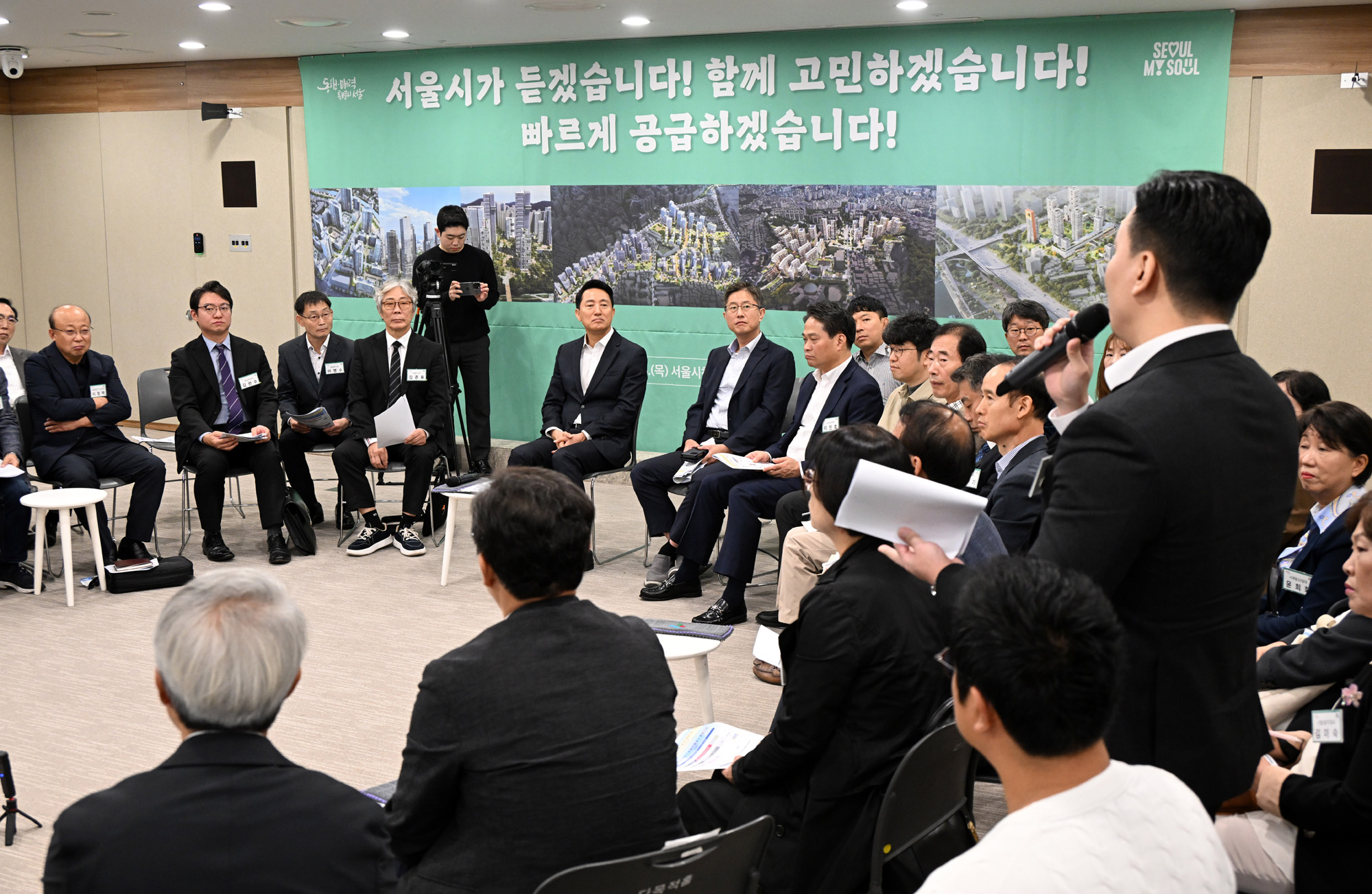 오세훈 서울시장이 16일(목) 오전 10시 서울시청 간담회장(8층)에서 ‘서울시 정비사업연합회’ 소속 주민대표들과 ‘주택공급 활성화를 위한 민?관정책협의회’를 개최했다. 서울시 제공