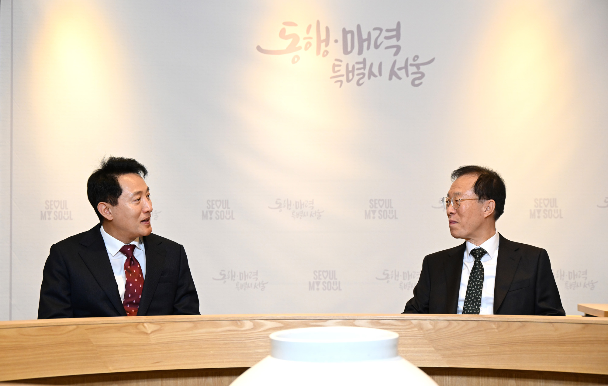 오세훈 서울시장이 22일(수) 오후 3시 서울시청 집무실(6층)에서 이석연 국민통합위원회 신임 위원장을 만나 다양한 협력 방안을 논의했다. 이번 면담은 이석연 위원장이 지난달 15일 국민통합위원회 위원장으로 취임한 후 첫 자치단체장 면담일정이다. 서울시 제공