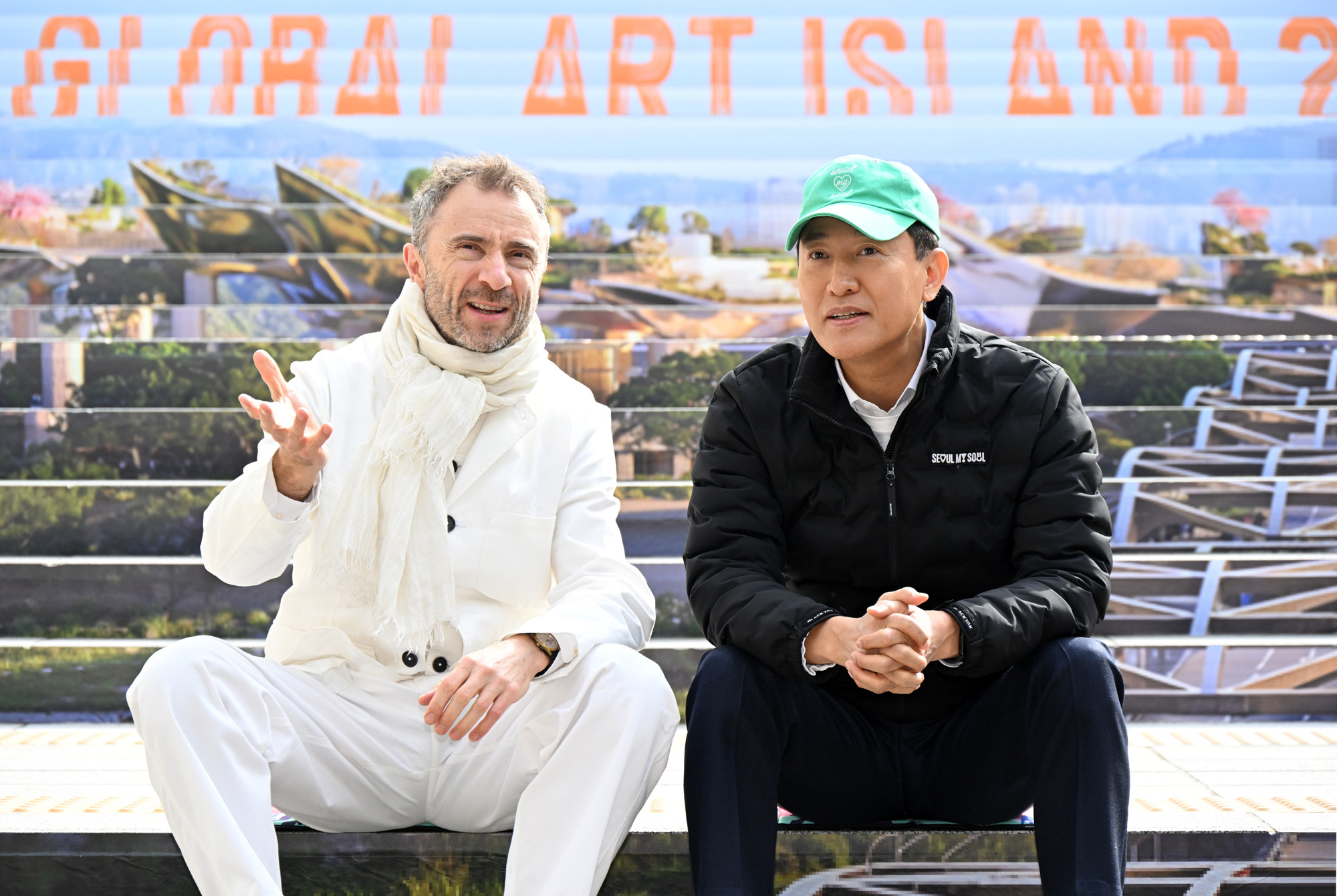 오세훈 서울시장이 21일(화) 오전 한강버스 선상에서 '노들 글로벌 예술섬' 설계를 맡은 토마스 헤더윅 건축가(가운데), 최호정 서울시의회 의장(왼쪽 첫 번째)과 기념촬영하고 있다. 서울시 제공