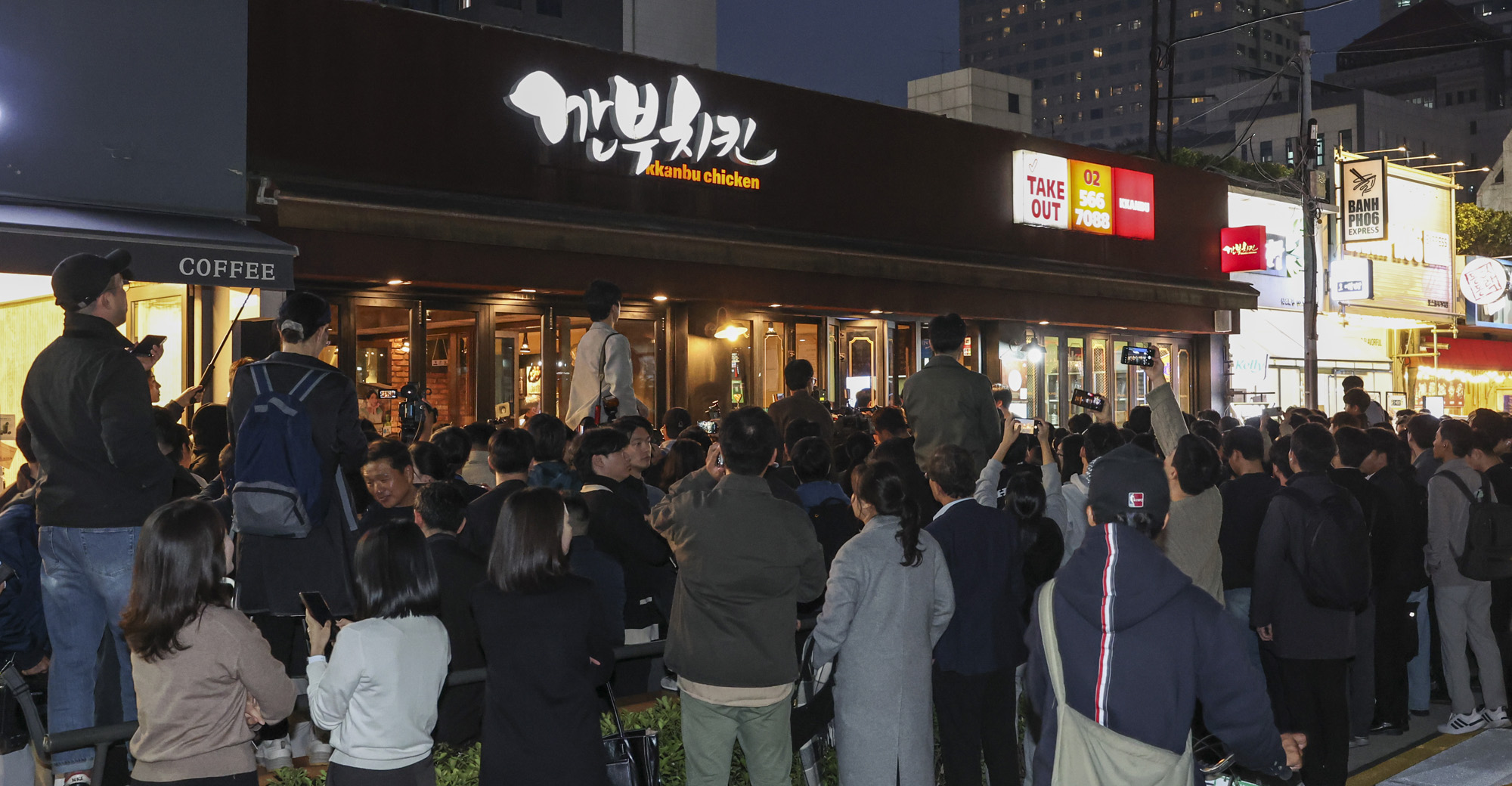 30일 서울 삼성동 인근 깐부치킨에서 젠슨황 엔비디아 최고경영자가 이재용 삼성전자 회장, 정의선 현대차 그룹 회장이 회동할 것으로 알려지자 취재진과 시민들로 붐비고 있다./2025.10.30