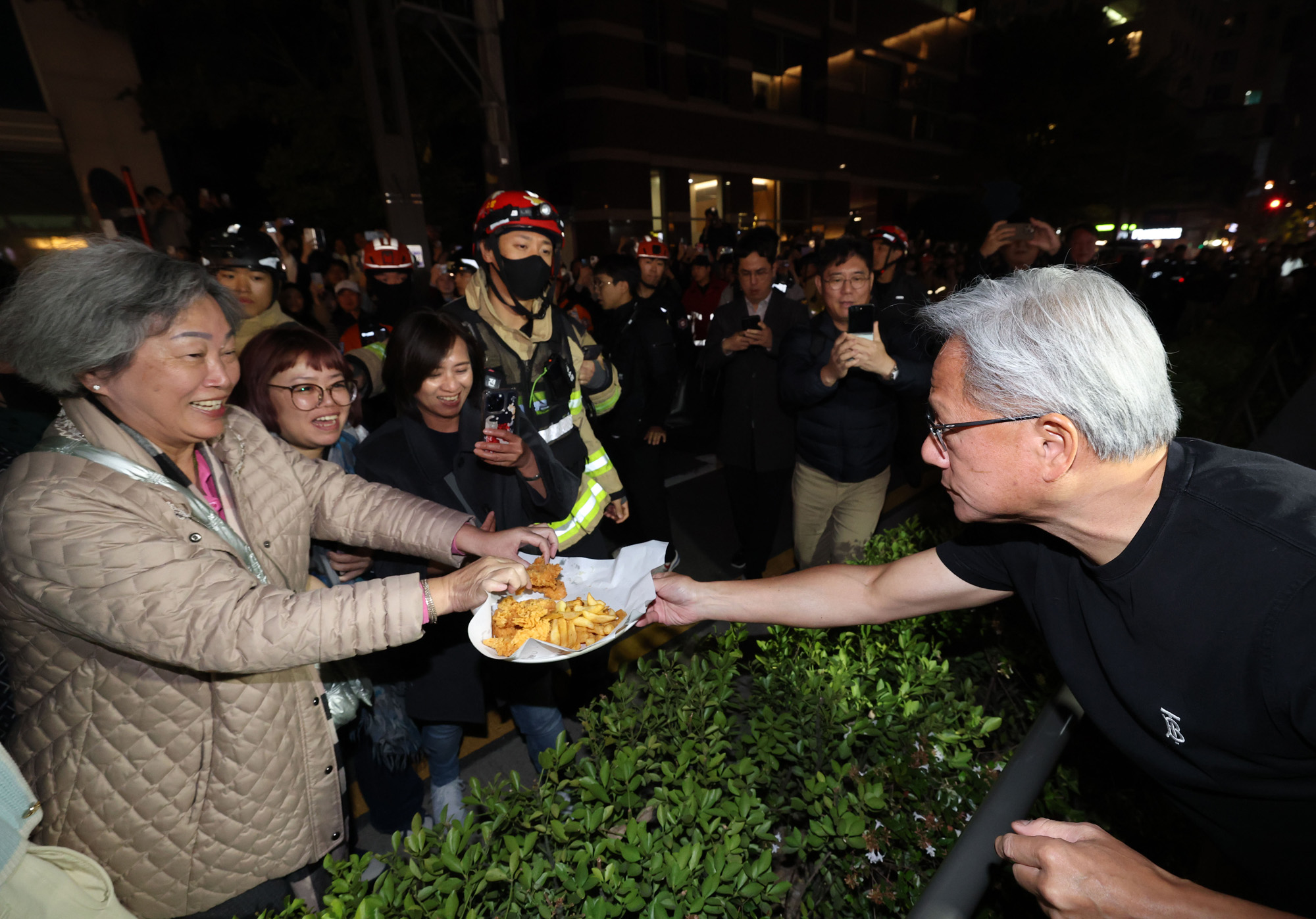 젠슨황 엔비디아 최고경영자가 30일 이재용 삼성전자 회장, 정의선 현대자동차그룹 회장과 서울 강남구 깐부치킨 매장에서 치킨 회동 중 밖으로 나와 시민들에게 치킨 등을 나눠주고 있다. 2025.10.30