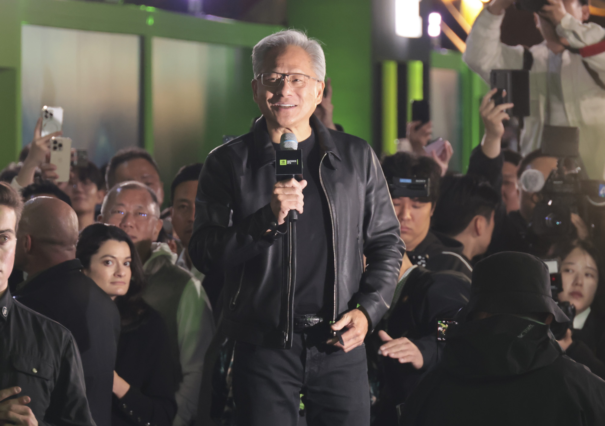 젠슨 황 엔비디아 최고경영자가 30일 오후 서울 강남구 코엑스광장에서 열린 '엔비디아 지포스 게이머 페스티벌' 주요 파트너 회사 부스에서 참관객들과 대화를 하고 있다.