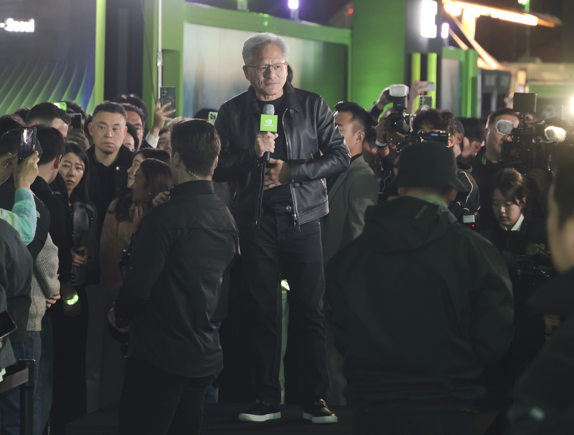 젠슨 황 엔비디아 최고경영자가 30일 오후 서울 강남구 코엑스광장에서 열린 '엔비디아 지포스 게이머 페스티벌' 주요 파트너 회사 부스에서 참관객들과 대화를 하고 있다.