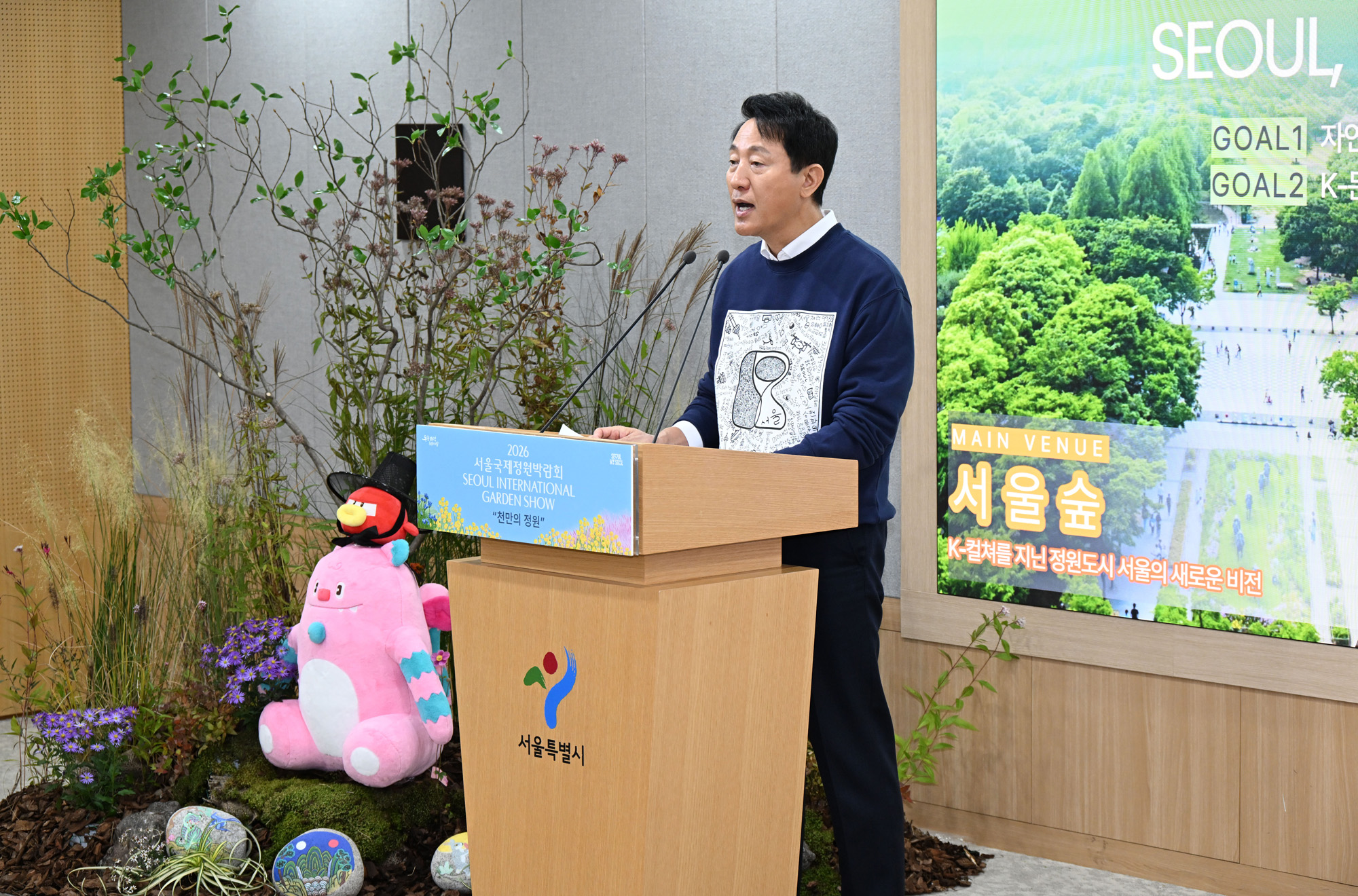 오세훈 서울시장이 3일 오전 서울시청에서 열린 2026년 서울국제정원박람회 기자설명회에서 내년도 계획을 소개하고 있다. 서울시 제공