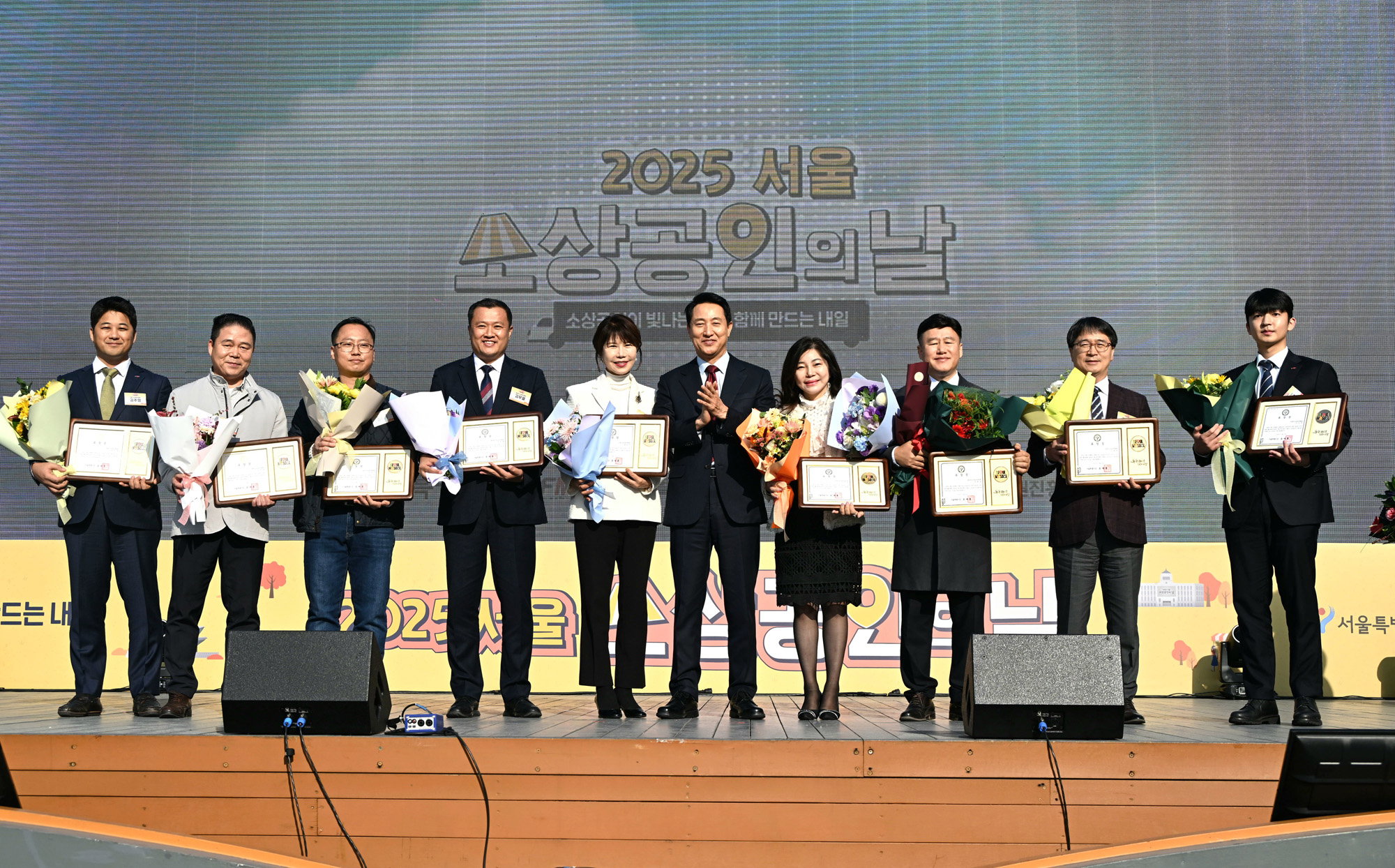 오세훈 서울시장은 5일(수) 오후 2시 서울광장에서 열린 ‘2025년 소상공인의 날 기념행사’에 참석해 소상공인 발전과 권익 향상에 기여한 14명에게 시장 표창을 수여하고 ‘민생경제의 뿌리’가 되어주는 소상공인에게 응원과 감사를 전했다. 서울시 제공