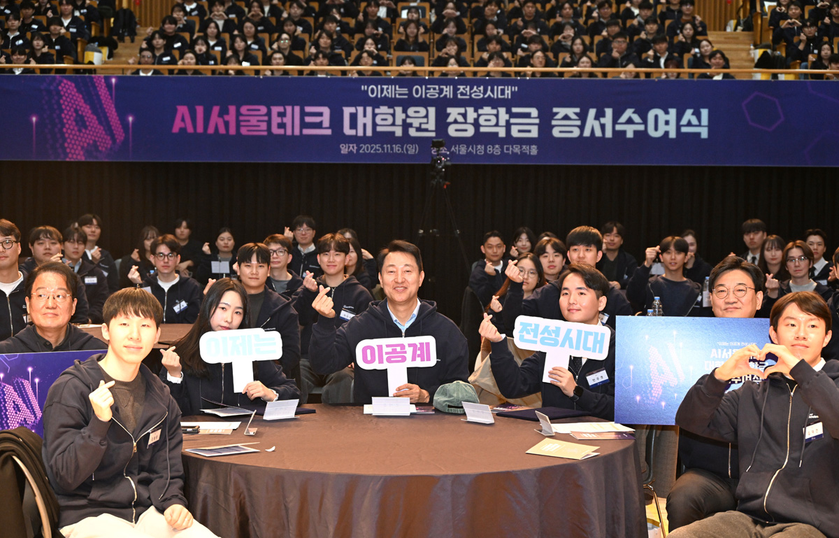 오세훈 서울시장이 16일(일) 오전 11시 서울시청 다목적홀에서 열린 2025년 2학기 AI 서울테크 대학원 장학금 증서 수여식에 참석하고 있다. 서울시 제공