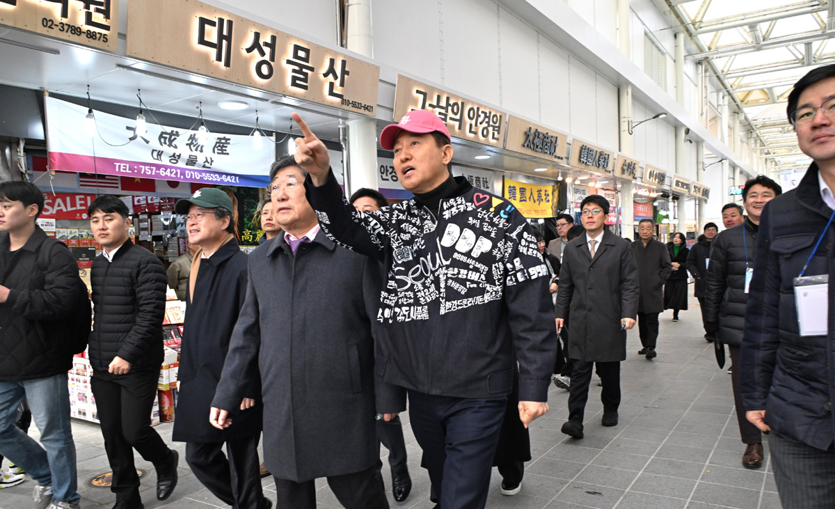 오세훈 서울시장이 17일(월) 중구 남창동 일대에서 열린 '남대문시장 아케이드 준공식'에서 주요 내빈들과 기념사진을 촬영하고 있다. 서울시 제공