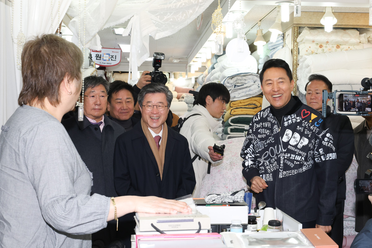 오세훈 서울시장이 17일(월) 중구 남창동 일대에서 열린 '남대문시장 아케이드 준공식'에서 주요 내빈들과 기념사진을 촬영하고 있다. 서울시 제공