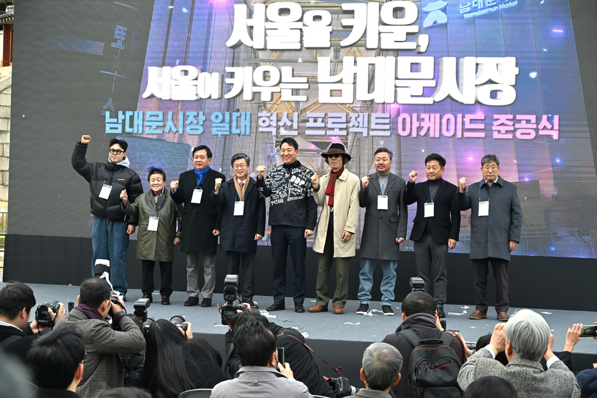 오세훈 서울시장이 17일(월) 중구 남창동 일대에서 열린 '남대문시장 아케이드 준공식'에서 주요 내빈들과 기념사진을 촬영하고 있다. 서울시 제공