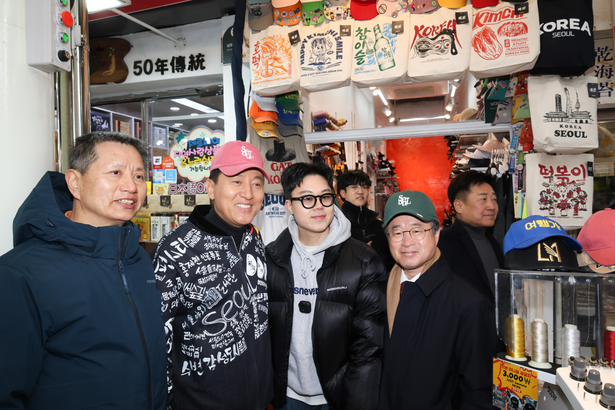 오세훈 서울시장이 17일(월) 중구 남창동 일대에서 열린 '남대문시장 아케이드 준공식'에서 주요 내빈들과 기념사진을 촬영하고 있다. 서울시 제공