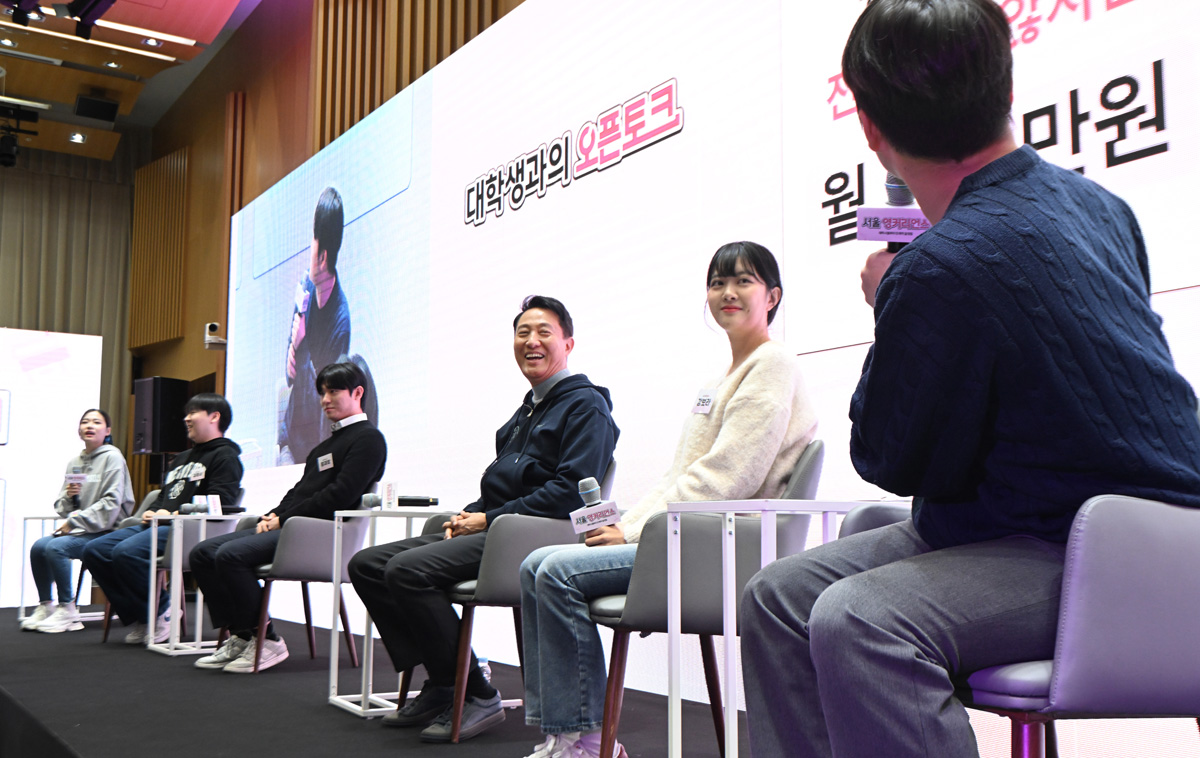 오세훈 서울시장이 19일(수) 서울시청에서 열린 ‘서울시 청년정책 일자리 분야 신규사업 설명회’에서 진행된 대학생과의 오픈토크에 참여하고 있다. 서울시 제공