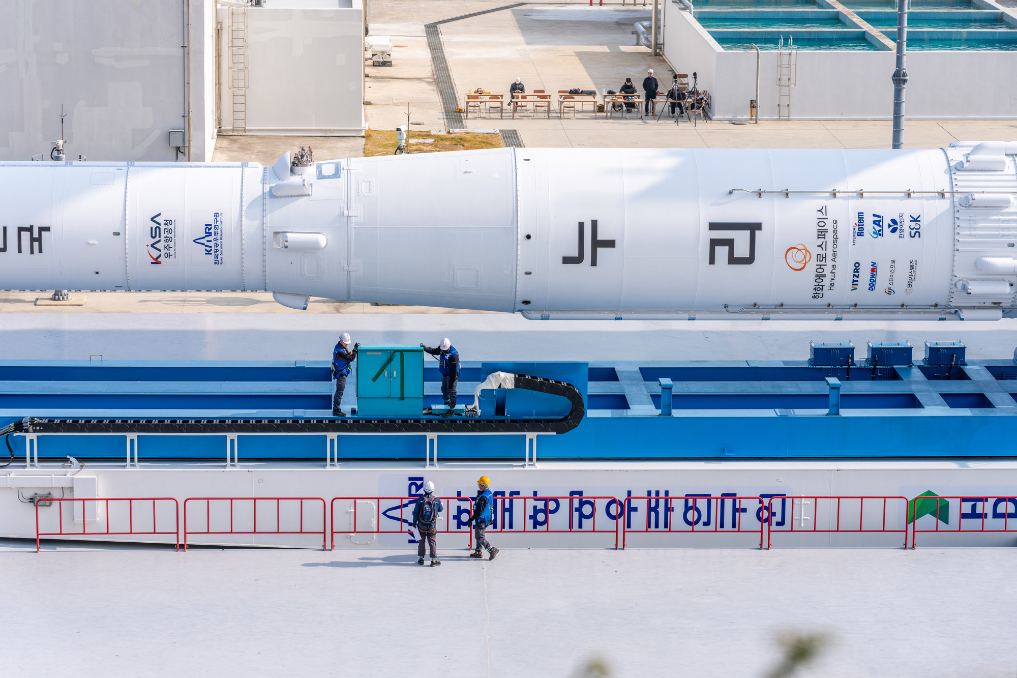 25년 11월 25일 전라남도 고흥 나로우주센터에서 누리호 4차 발사를 위한 이송 및 기립 작업을 수행하고 있다.