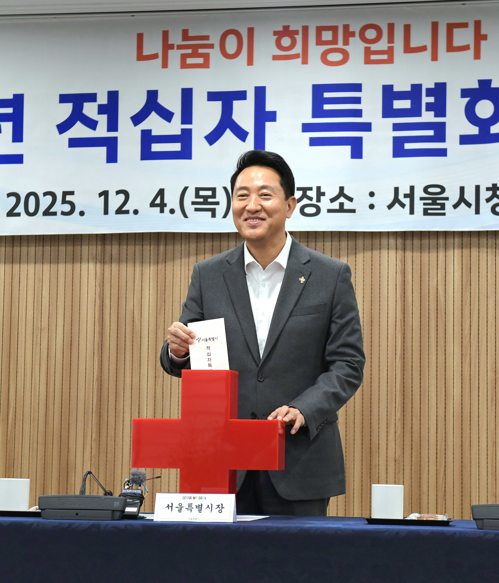 오세훈 서울시장은 4일(목) 오후 2시 서울시청(8층 간담회장)에서 열린 ‘2026 적십자 서울지사 특별회비 전달식’에 참석해 권영규 대한적십자사 서울지사 회장에게 성금을 전달했다. 서울시 제공