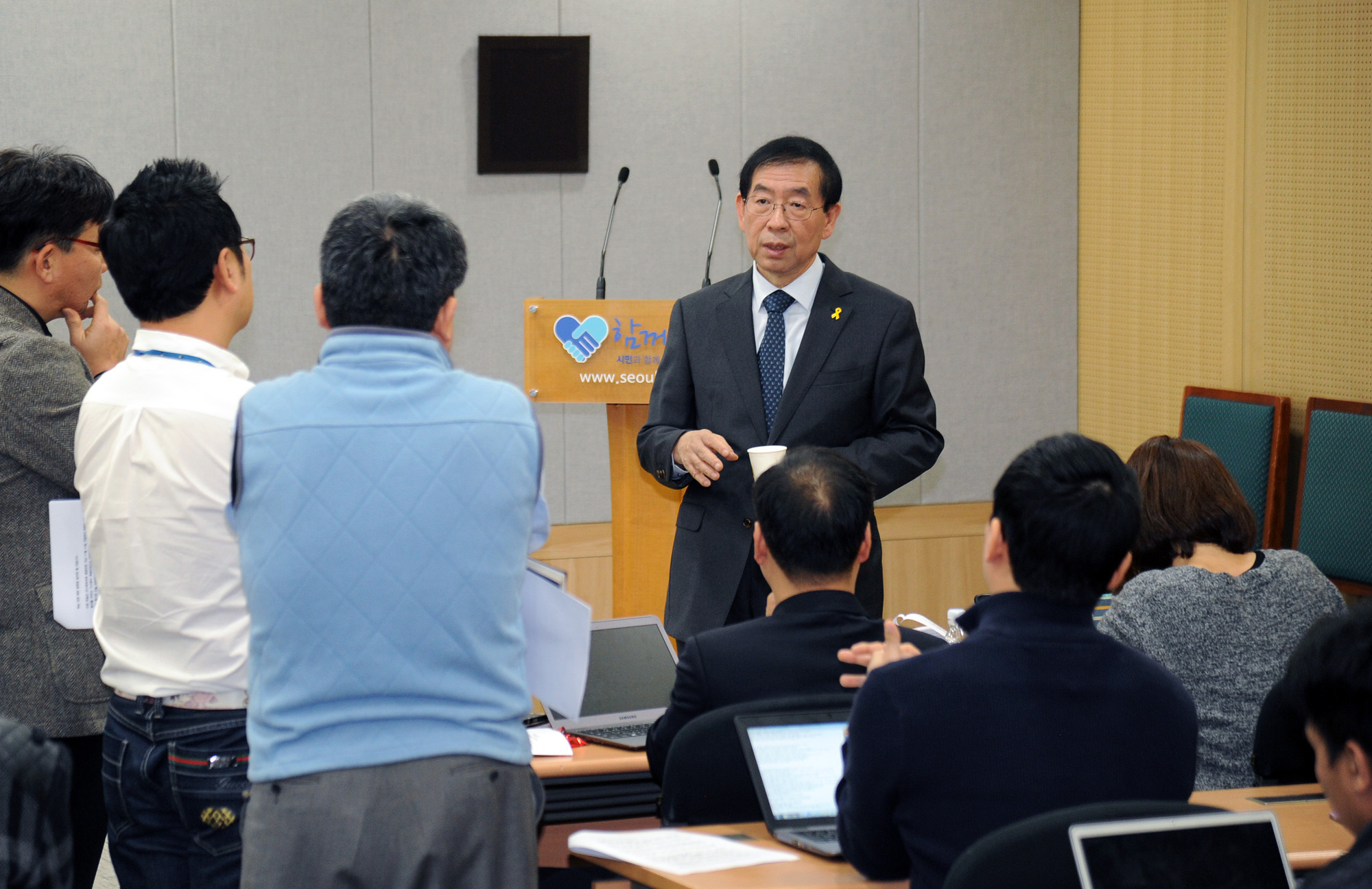 박원순 시장이 22일 오전 서울 시청 브리핑룸에서 이날 오전 정부서울청사에서 열린 국무회의에서의 논의내용과 관련 기자들과 간담회를 하고 있다. 서울시 제공