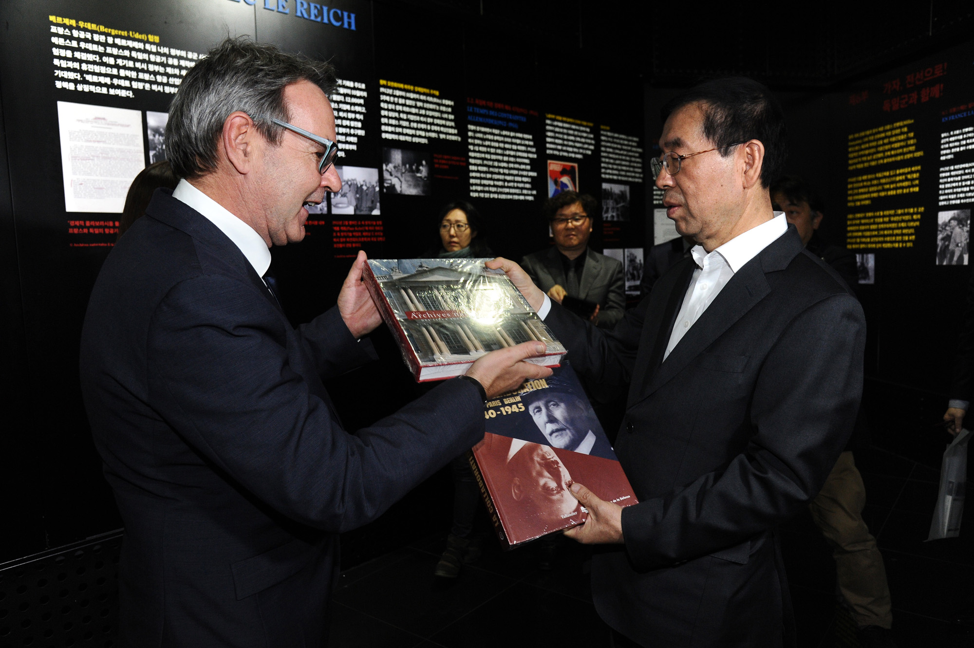 박원순 서울시장과 참석자들이 24일 오후 서울시청 시민청에서 열린 한불수교 130주년 기념 초청전시 '콜라보라시옹 프랑스의 나치부역자들 1940-1945'를 관람하고 있다. 서울시 제공