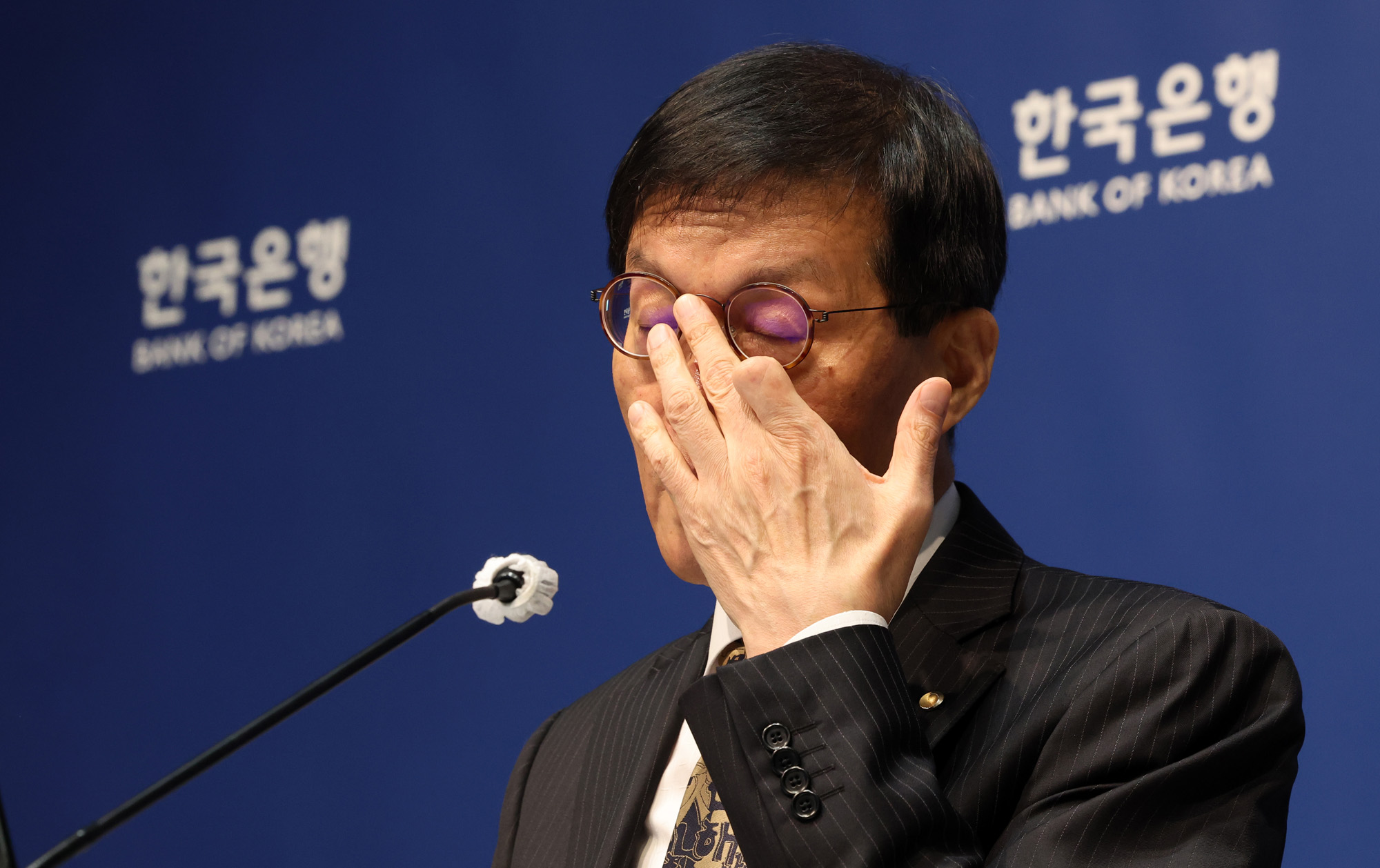 이창용 한국은행 총재가 23일 서울 중구 한국은행에서 열린 금융통화위원회 금리 결정에 대한 기자간담회에서 안경을 고쳐쓰고 있다. 2025.10.23 사진공동취재단
