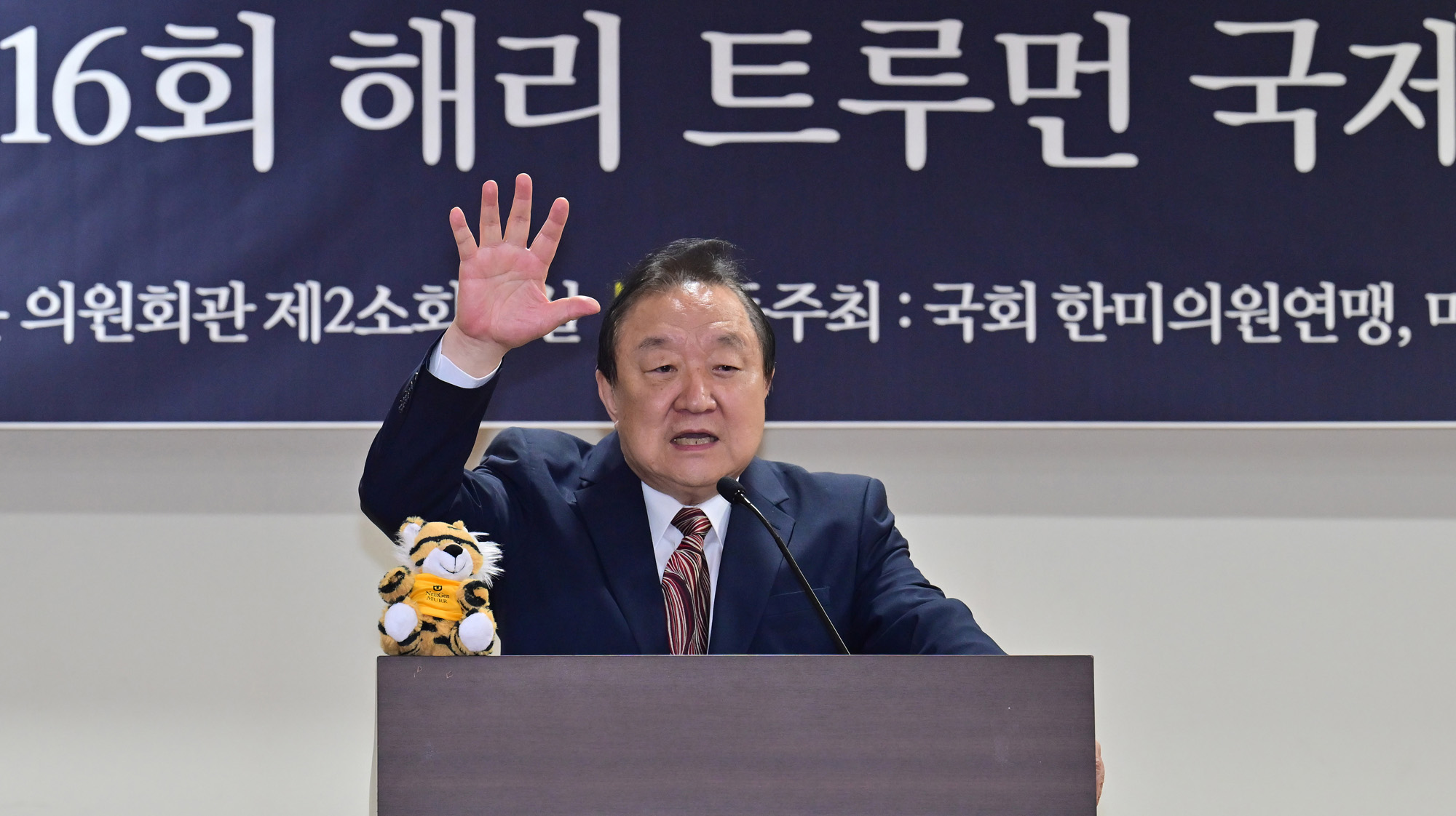 | 사진설명 | 정대철 헌정회장이 24일 서울 여의도 국회 의원회관에서 열린 '제16회 해리 트루먼 국제 컨퍼런스'에서 축사를 하고 있다. 올해로 16번째를 맞은 콘퍼런스는 한국전쟁 당시 미주리주 출신 미국 제33대 대통령 해리 트루먼의 한미 관계와 우호 증진에 기여한 업적을 기리기 위한 국제회의로 한국과 미국 미주리대학에서 2년에 한 번씩 교차로 개최됐다. 국회 한미의원연맹과 미주리대학의 공동개최로 열린 올해 컨퍼런스에서 '변화, 혁신, 미래를 향한 한미 협력'을 주제로 민주주의 발전과 원자력, 인공지능(AI) 등 한미 과학기술 등이 논의됐다. 2025.10.24 사진공동취재단 |