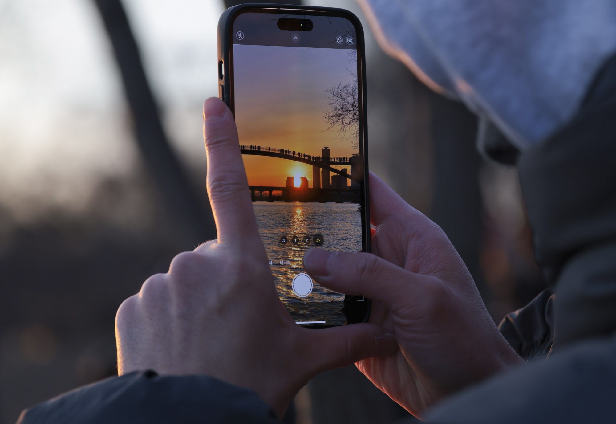 [eoimage=서울] 박정훈 기자= 2026년 병오년 새해 첫 날인 1일 오전 서울 영등포구 선유도 공원을 찾은 시민이 선유교 뒤로 떠오르는 새해 첫 해를 휴대폰으로 찍고 있다. 2026.1.1.