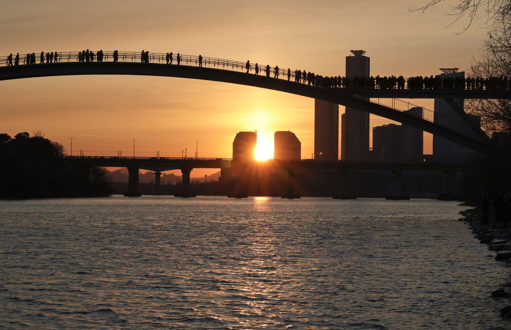 [eoimage=서울] 박정훈 기자= 2026년 병오년 새해 첫 날인 1일 오전 서울 영등포구 선유도 공원 선유교 뒤로 새해 첫 해가 떠오르고 있다. 2026.1.1.