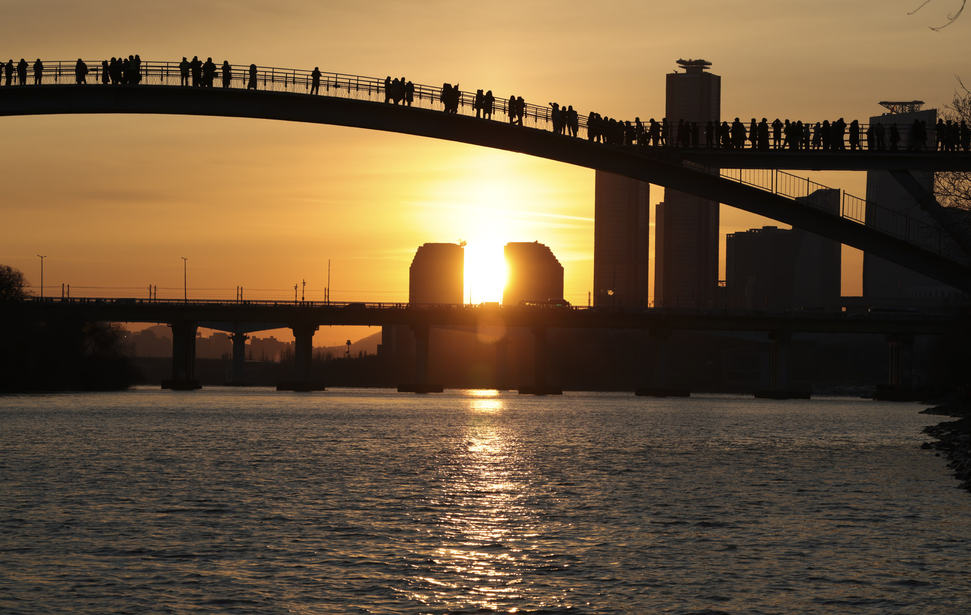 [eoimage=서울] 박정훈 기자= 2026년 병오년 새해 첫 날인 1일 오전 서울 영등포구 선유도 공원 선유교 뒤로 새해 첫 해가 떠오르고 있다. 2026.1.1.