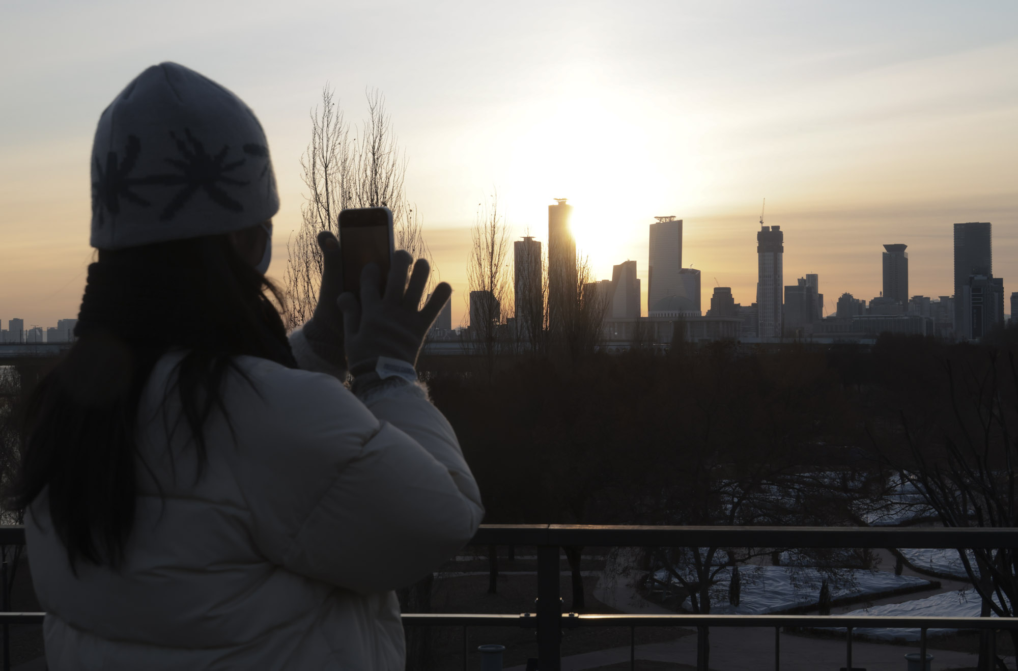 [eoimage=서울] 박정훈 기자= 2026년 병오년 새해 첫 날인 1일 오전 서울 영등포구 선유도 공원을 찾은 시민이 새해 첫 태양이 떠오르는 모습을 휴대폰에 담고 있다. 2026.1.1.