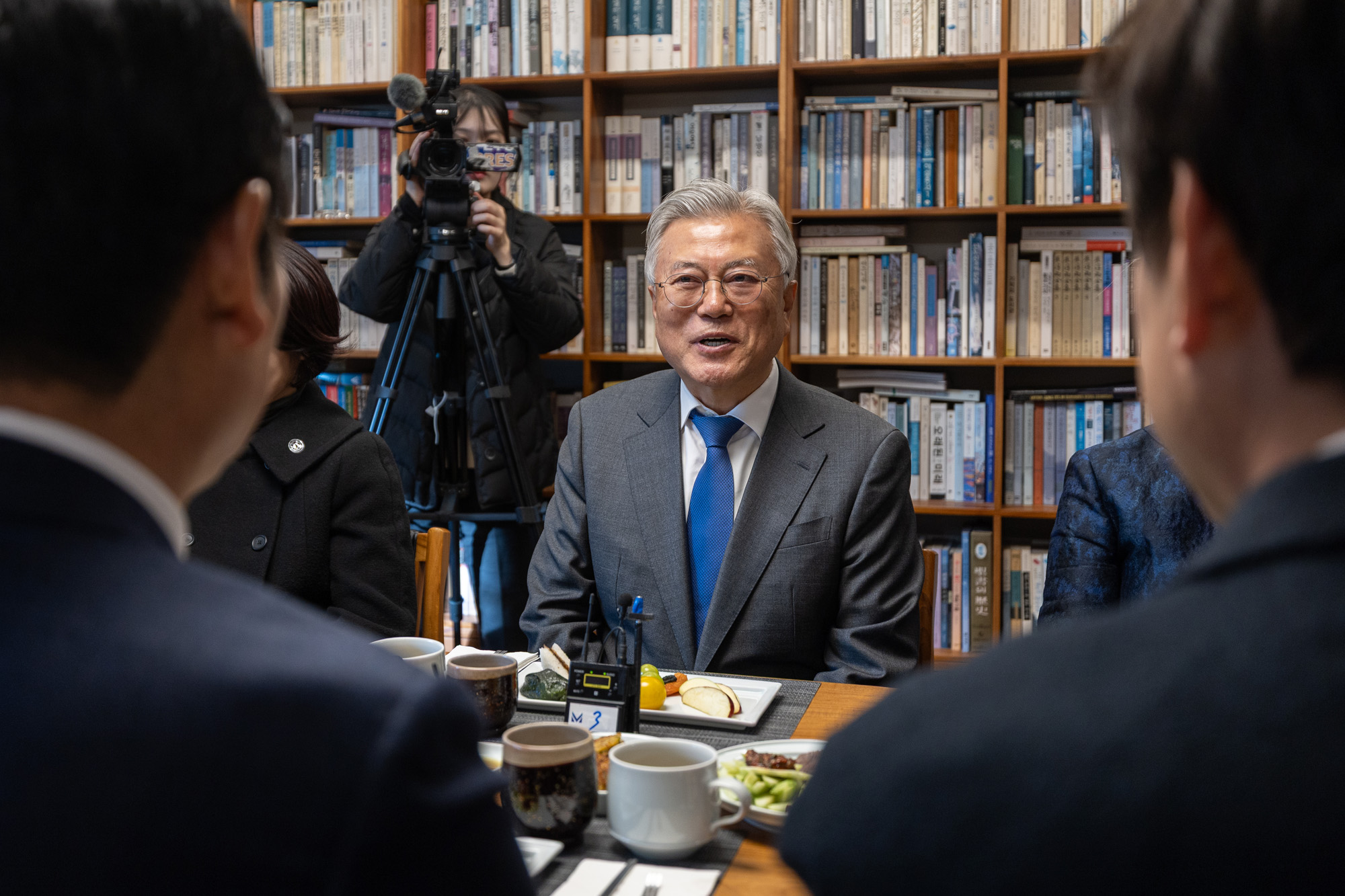 1일 더불어민주당의 정청래 대표를 비롯한 지도부들이 경산의 문재인 전 대통령을 예방하여 인사하고 기념촬영을 하고 있다. 2026.01.01. 더불어민주당 제공