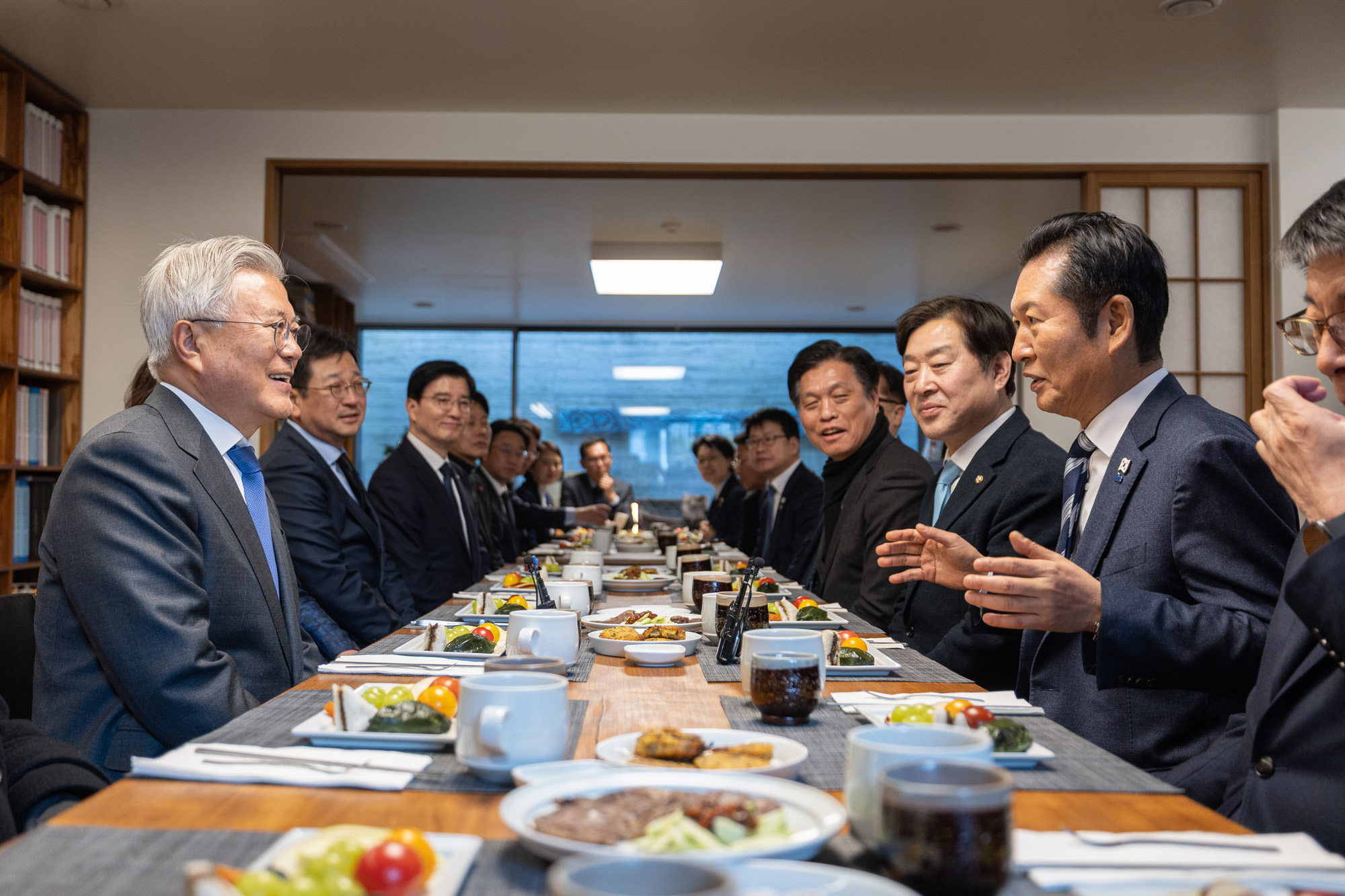 1일 더불어민주당의 정청래 대표를 비롯한 지도부들이 경산의 문재인 전 대통령을 예방하여 인사하고 기념촬영을 하고 있다. 2026.01.01. 더불어민주당 제공