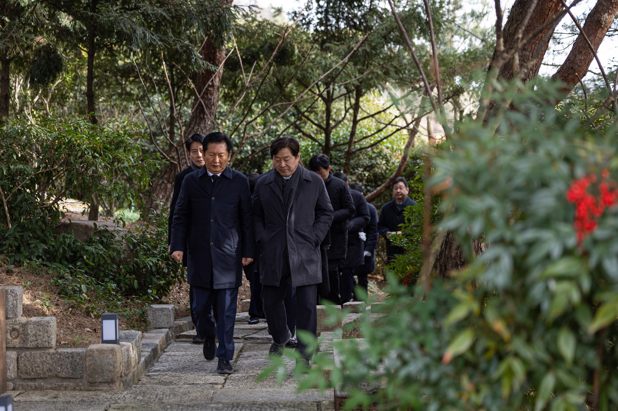 1일 더불어민주당 정청래 대표를 비롯한 지도부들이 노무현 전 대통령 묘역을 방문해 참배하고 권양숙 여사를 예방하고 있다. 2026.01.01. 더불어민주당 제공