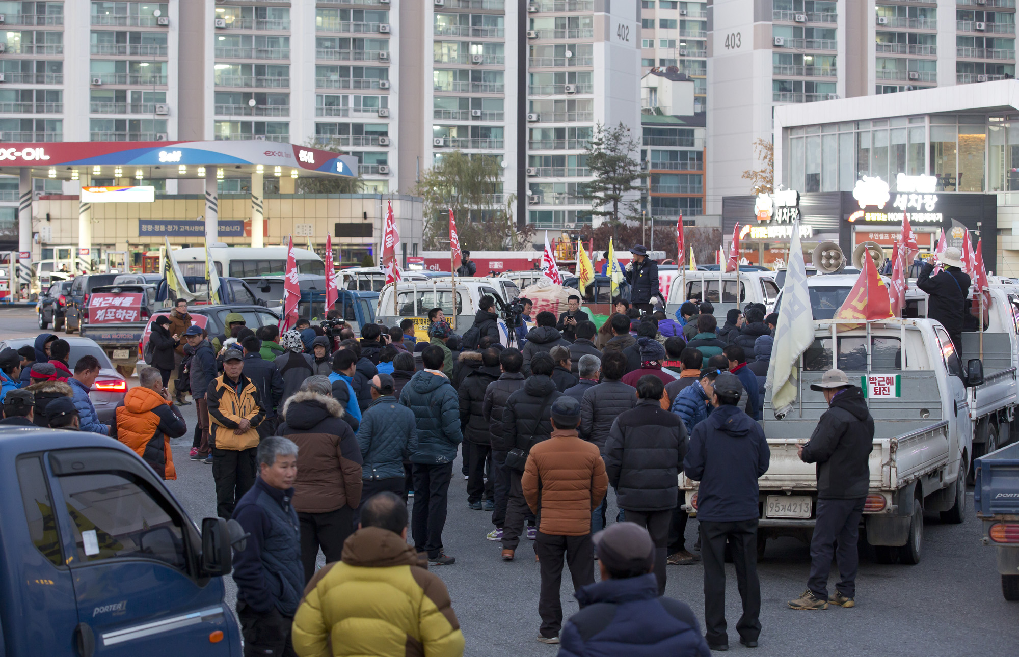 [서울=eoimage] 임준선기자 =전국농민회총연맹(전농)의 상경투쟁 차량이 속속 서울방면으로 움직이고 있는 25일 오후 경기도 용인시 죽전휴게소에 트럭이 집결하고 있다. 모인 트럭은'박근혜 퇴진'이라고 쓰인 깃발을 달고 있다. 경찰은 휴게소 출구 쪽에 순찰차를 배치, 상경을 막아서면서 농민들과 대치 중이다. 2016.11.245 eoamster@eoimage.co.kr |