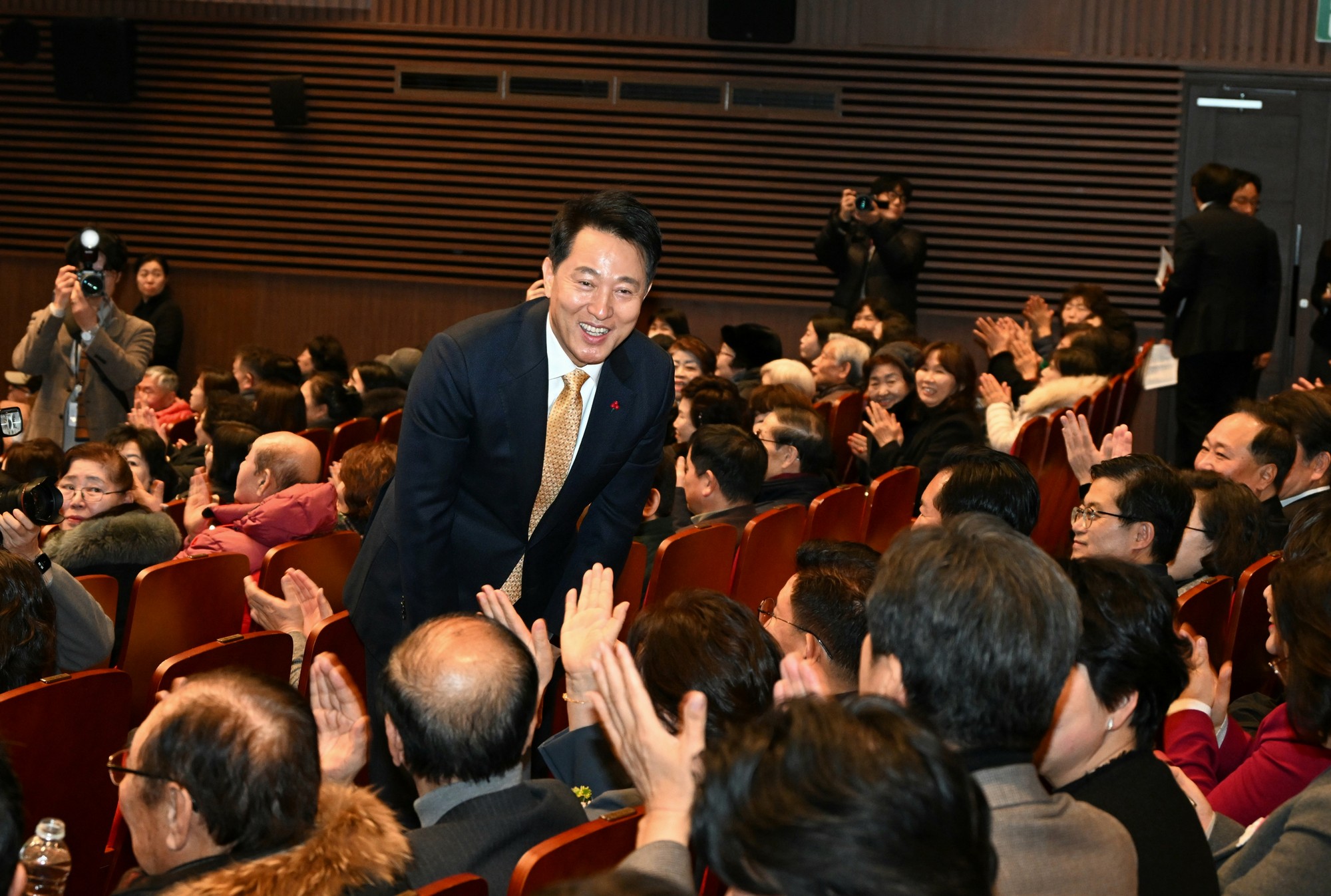 | 사진설명 | 오세훈 서울시장이 7일(수) 오후 양천구와 마포구에 열린 ‘신년인사회’에 차례로 참석해 시정 운영 방향을 소개하고 지역주민과 소통했다. 이 자리에서 오 시장은 자치구별 현안을 논의하고 서울시가 핵심적으로 추진하고 있는 ’손목닥터9988‘과 ’서울체력9988인증센터‘, ’서울야외도서관‘ 등 시민체감형 정책도 공유했다. 서울시 제공 |