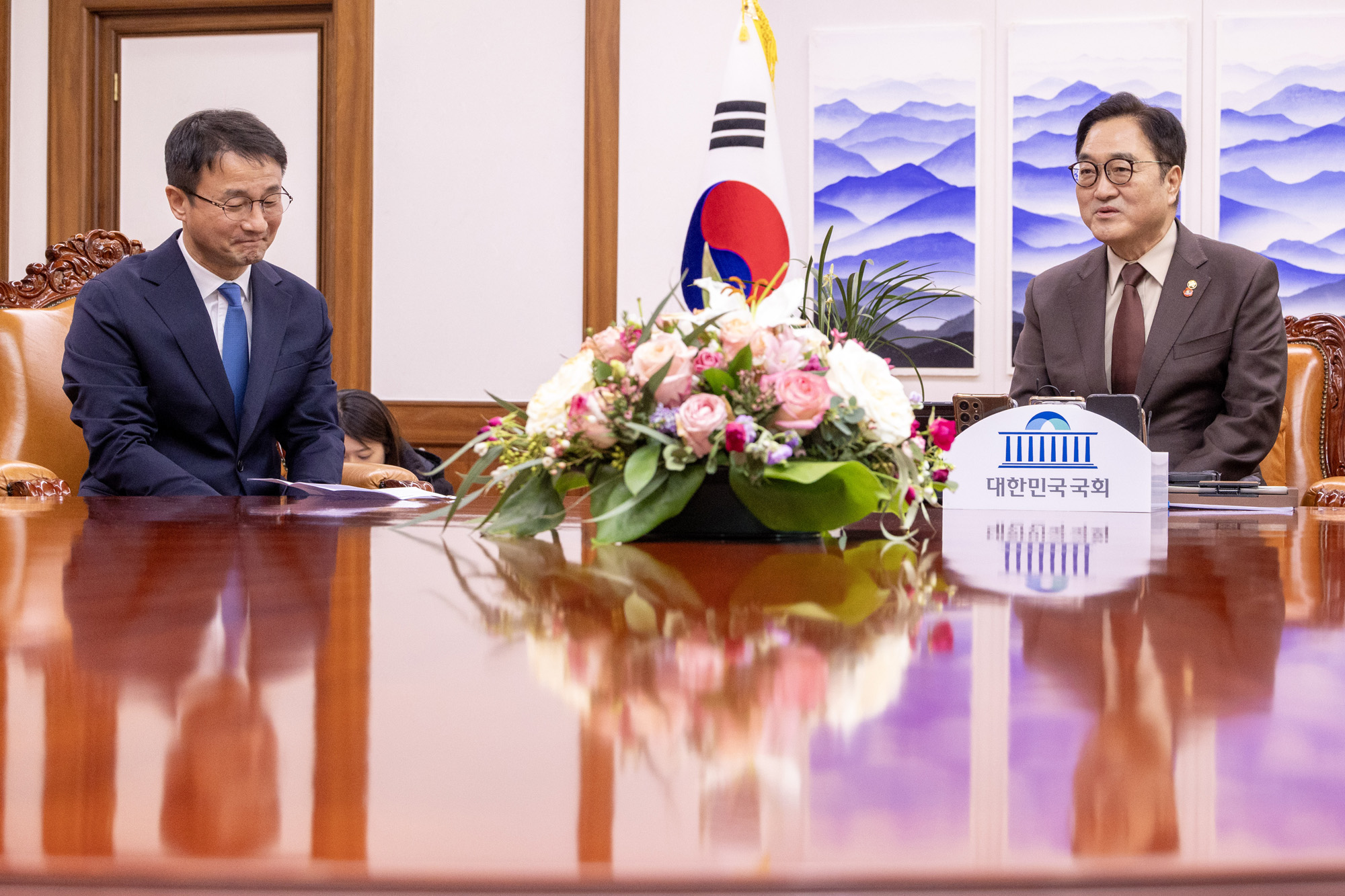 우원식 국회의장(오른쪽)이 12일 오전 서울 여의도 국회 의장실에서 한병도 더불어민주당 신임 원내대표를 접견하고 있다. 2026.01.12