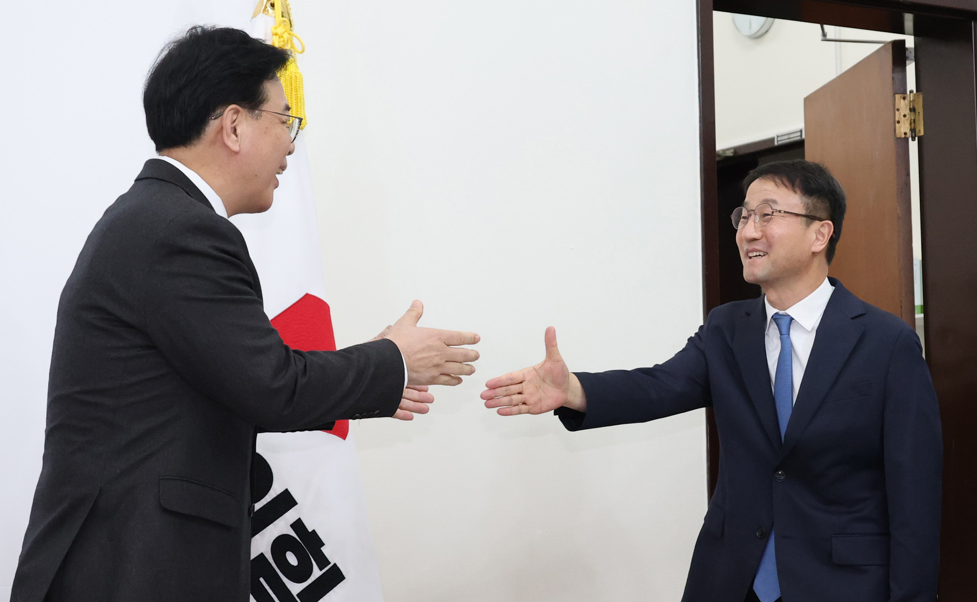 한병도 신임 더불어민주당 원내대표(오른쪽)와 송언석 국민의힘 원내대표가 12일 국회 국민의힘 원내대표실에서 접견에 앞서 악수하고 있다. 2026.1.12