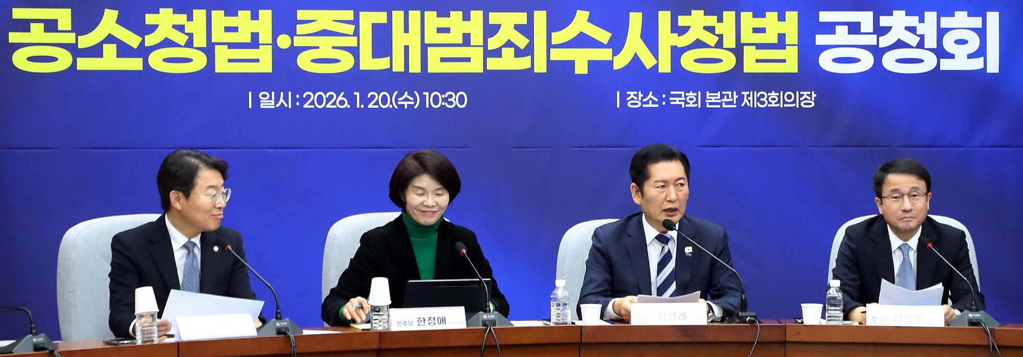 정청래 더불어민주당 대표가 20일 서울 여의도 국회에서 열린 공소청법-중대범죄수사청법 공청회에서 발언하고 있다. 민주 의원들이 공청회에 참석하고 있다. 2026.01.20.