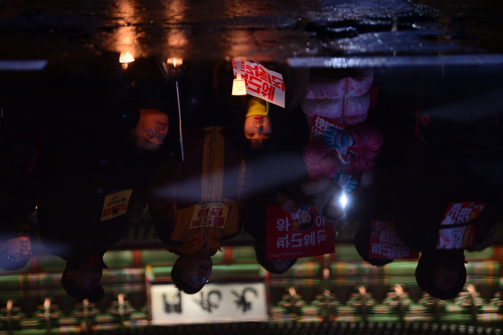 26일 오후 서울 광화문광장에서 5차 촛불집회가 열린 가운데 촛불 든 참가자들의 모습이 녹은 눈에 반영되고 있다. 20161126 사진공동취재단