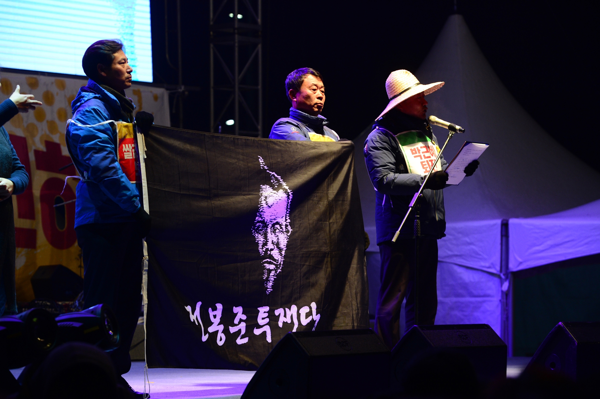 26일 오후 서울 광화문광장에서 5차 촛불집회가 열린 가운데 트랙터를 끌고 상경한 전봉준투쟁단이 자유발언을 하고 있다. 전봉준투쟁단의 트랙터는 경찰의 저지로 상경하지 못했다. 20161126 사진공동취재단